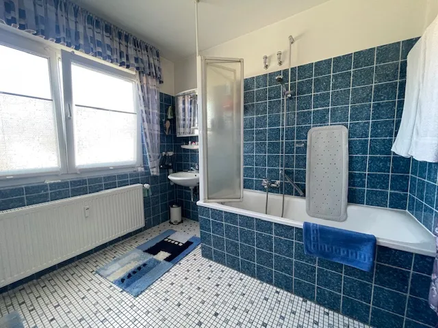 Die Immobilie besteht aus zwei separaten Hälften (die rechte Hälfte ist zum 30.9.2025 frei geworden), die jeweils über vier Zimmer plus Essdiele, eine Küche, ein Badezimmer und ein Gäste-WC verfügen.