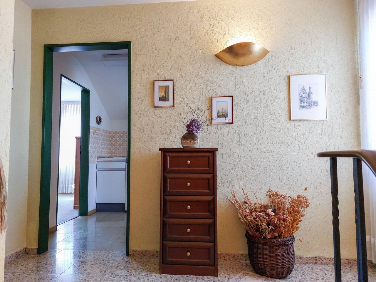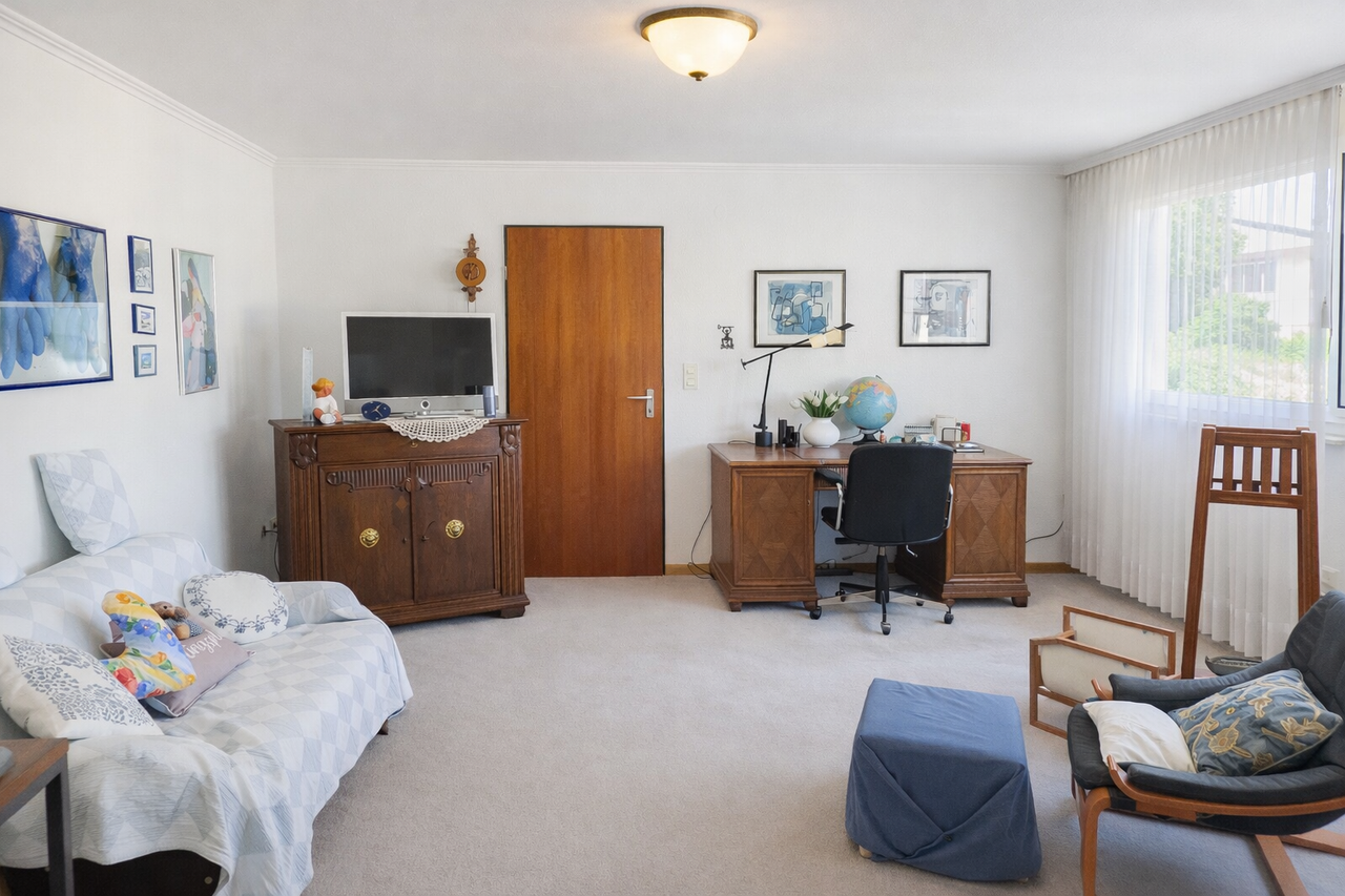 Im Untergeschoss befindet sich die Einliegerwohnung mit separatem Eingang. Diese Einheit verfügt über ein Schlafzimmer, einen Wohnraum, eine kleine Küchenzeile und ein Wannenbad. Ideal zur Vermietung, da der Zugang nicht über den Hausflur der Hauptwohnung erfolgt.
