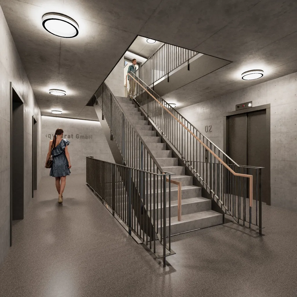 Moderne sanitäre Anlagen sind getrennt für Herren und Damen vorhanden, und barrierefreie WCs befinden sich auf jeder Etage, was den Komfort und die Zugänglichkeit für alle Mieter und Besucher gewährleistet. Diese umfassende Barrierefreiheit betont die moderne und inklusive Ausrichtung des gesamten Gebäudes.