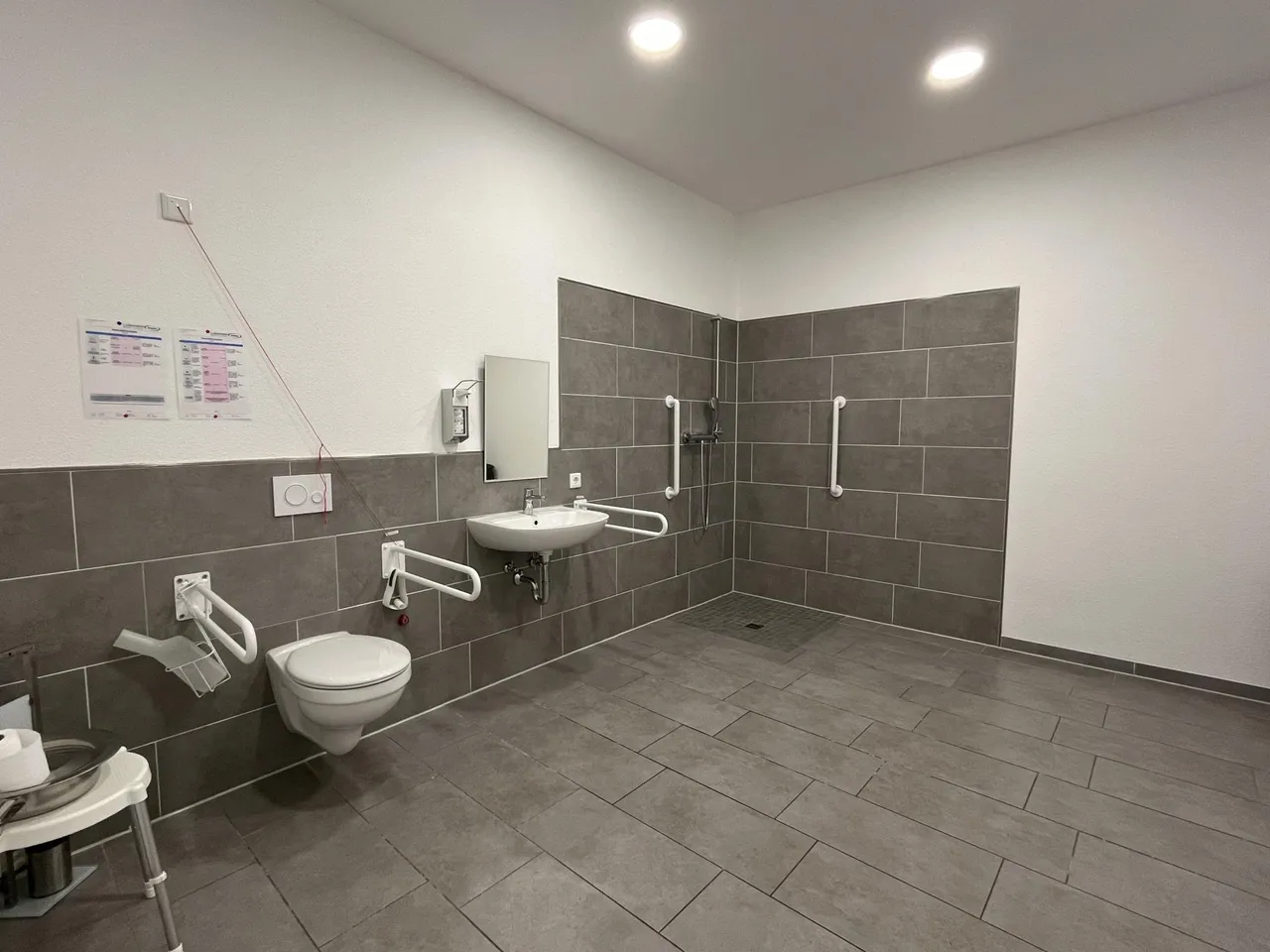 Das Gebäude wurde seinerzeit sehr aufwändig, solide und repräsentativ errichtet. Besonders die Pflegeeinrichtung im Erdgeschoss präsentiert sich sehr hell und freundlich, besonders großzügig sind hier die gemeinschaftlich genutzten Räumlichkeiten wie der Empfangsbereich und der Aufenthaltsraum ausgefallen. Die insgesamt sieben 1-Bett-Patientenzimmer sind mit neuen, behindertengerechten Bädern (max. 5 Jahre alt) ausgestattet.