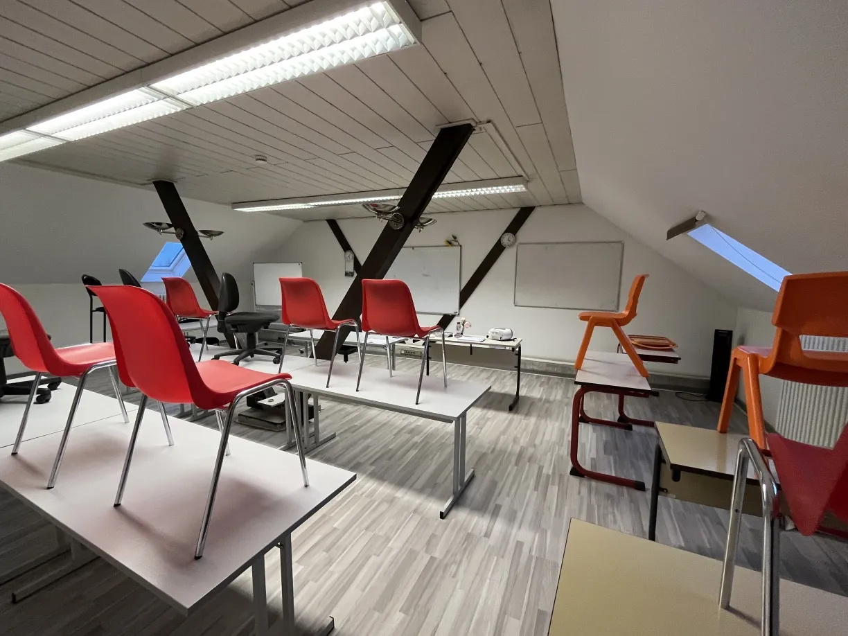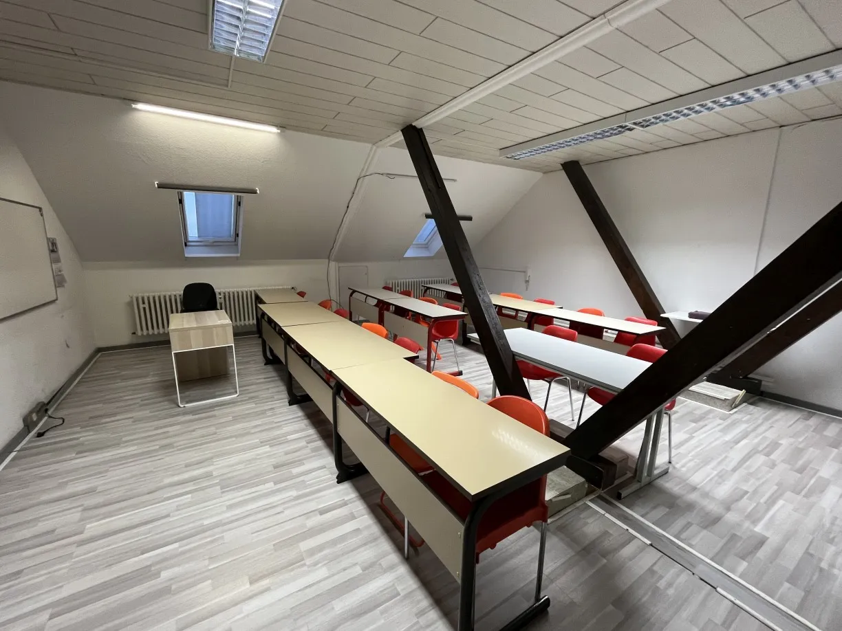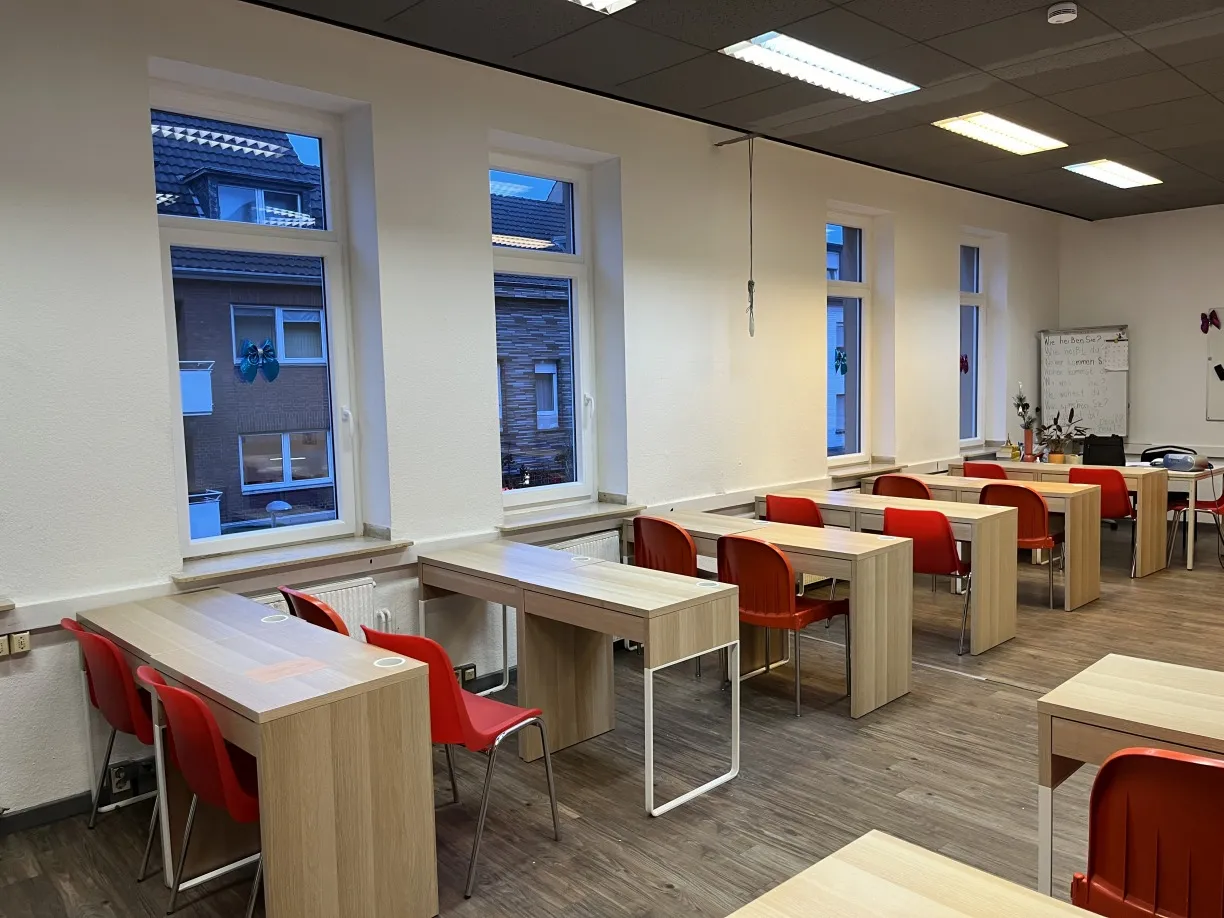 Die Schulungsräume mit eigenem Eingang von der Homberger Straße aus sind dagegen relativ einfach aber zweckmäßig ausgestattet. Die Fenster sind überwiegend aus Kunststoff und isolierverglast, die Böden sind mit Nadelfilz oder Laminat ausgelegt. Es stehen in den Vollgeschossen jeweils nach Geschlechtern getrennte, einfache WC-Anlagen zur Verfügung. Die Beheizung erfolgt über einen Fernwärmeanschluss.