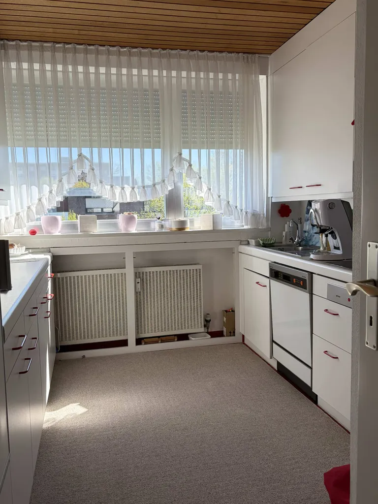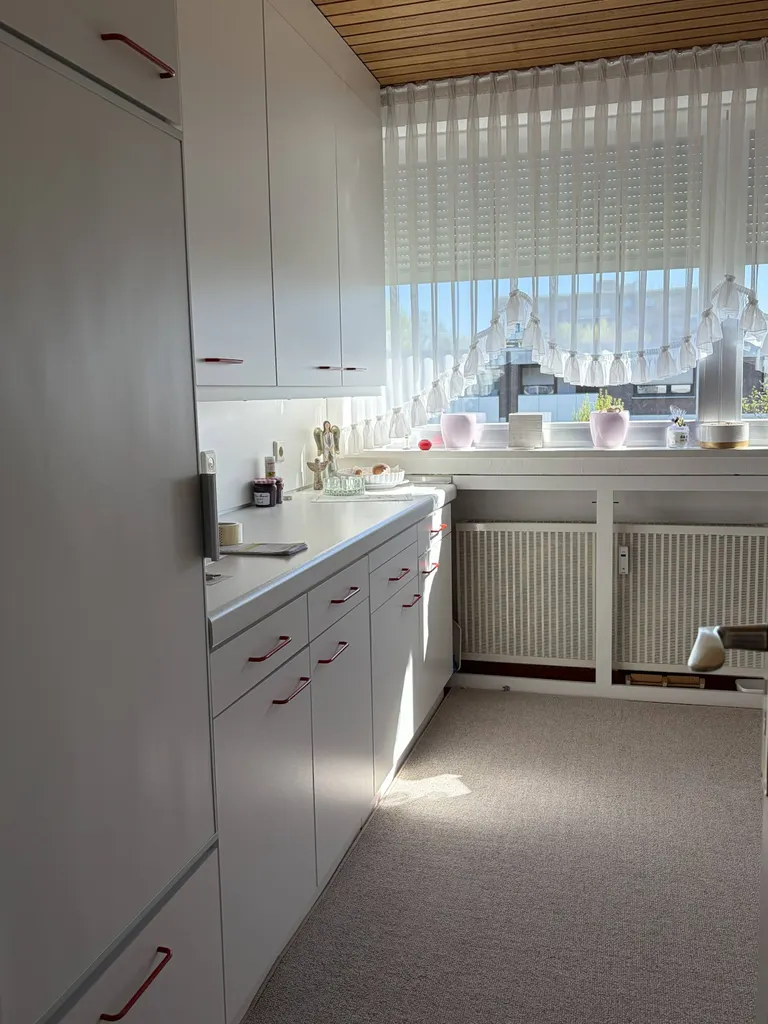 Die Wohnung präsentiert sich hell und gepflegt. Zur Ausstattung zählen u.a. Teppichboden in allen Räumen, Raufasertapeten, doppelt verglaste Aluminiumfenster mit Außenrollos (teilweise elektrisch), Loggia mit Markise, weiße Holzdecken sowie Innentüren und eine moderne Wohnungseingangstür. Das Badezimmer stammt aus dem Baujahr, wurde jedoch optisch etwas überarbeitet. Es ist mit weiß gestrichenen Fliesen, einer Badewanne sowie einem Bidet ausgestattet.
