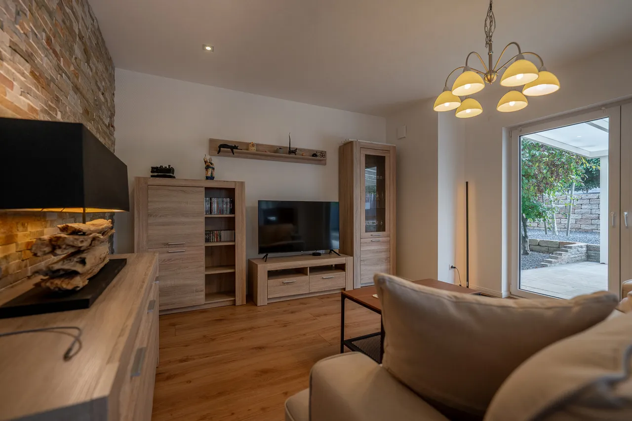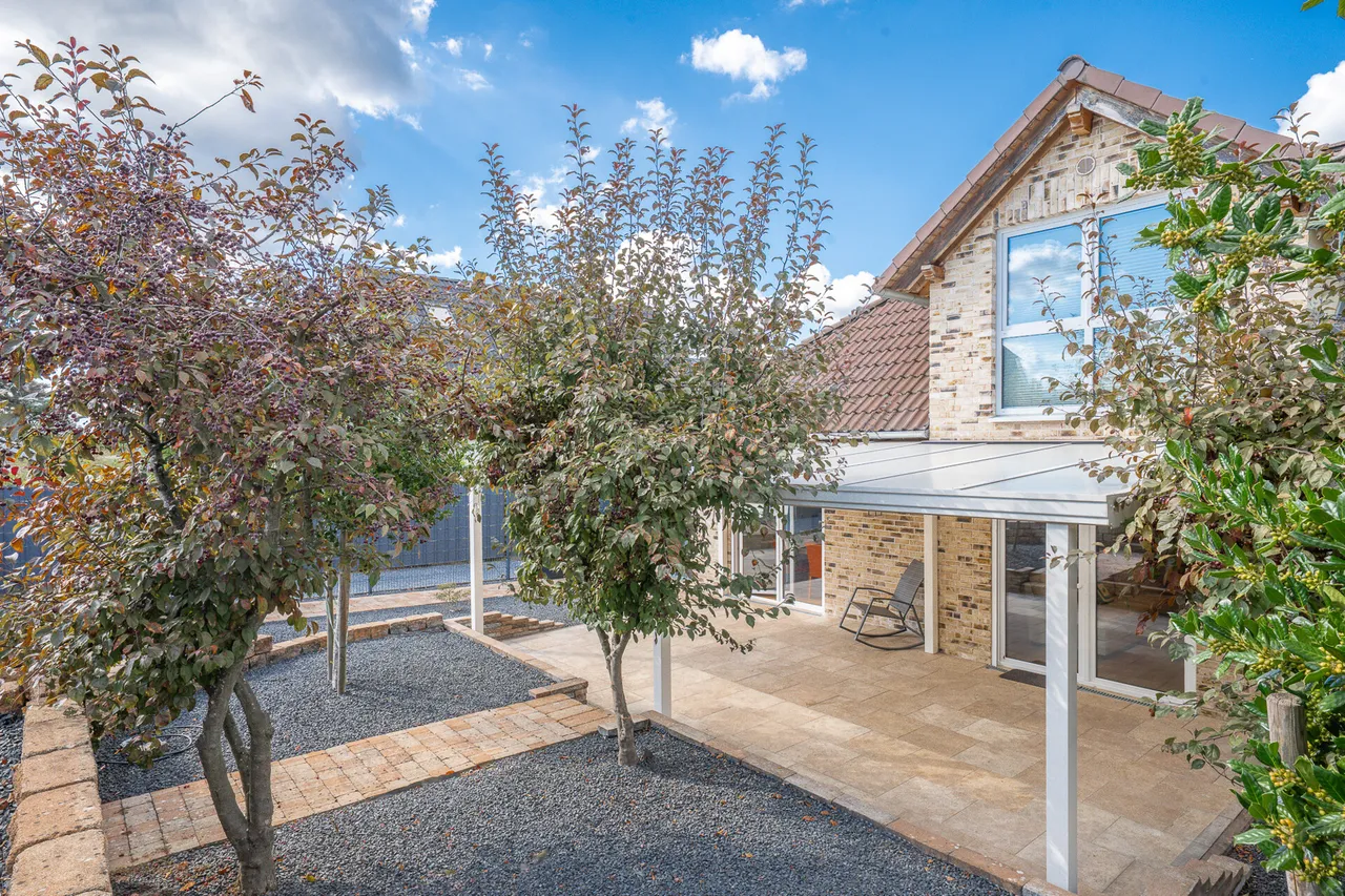 Draußen setzt sich die Harmonie fort: Die Garage, separate Stellplätze und der pflegeleicht angelegte Garten runden das Gesamtbild ab. Ein Rückzugsort, der zugleich Freiraum schenkt – für entspannte Stunden, gesellige Treffen oder einfach Momente des Glücks.