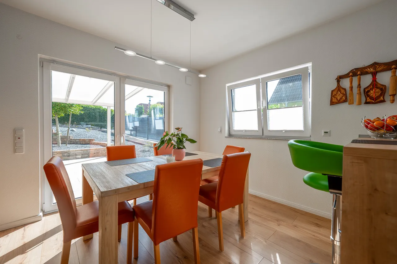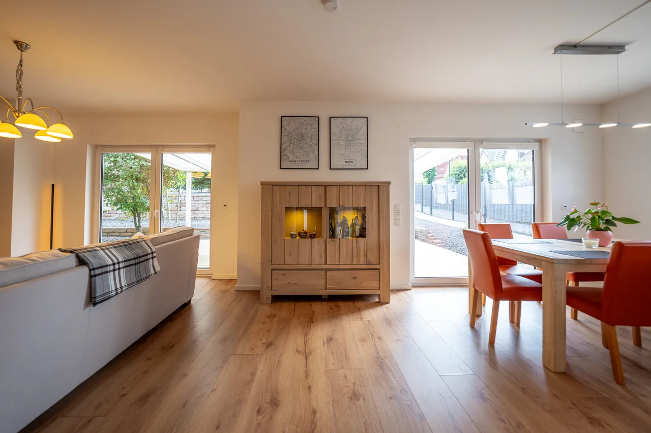 Das Herzstück des Hauses ist der großzügige Wohn-, Ess- und Kochbereich. Sonnenlicht flutet die Räume, große Fenster öffnen sich zur überdachten Süd-Terrasse und dem Garten – ein Ort, an dem Sie jeden Tag spüren, wie Wohnträume wahr werden. Ob entspanntes Frühstück, gesellige Abende oder ruhige Momente mit Blick ins Grün: Hier lebt es sich leicht, unbeschwert und voller Energie.