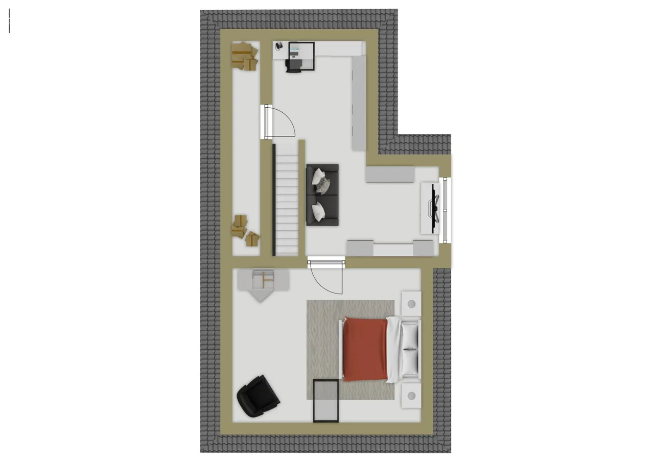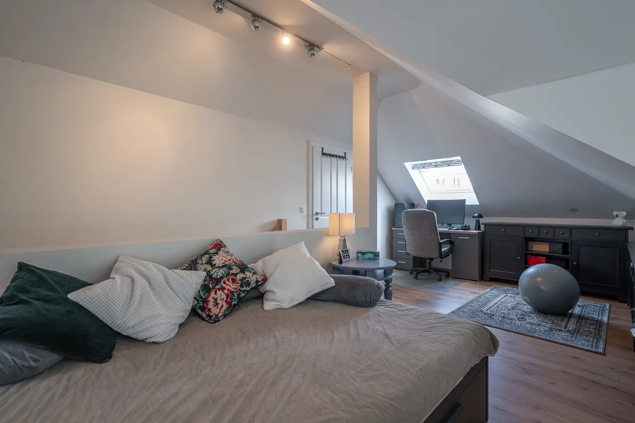 Das Dachgeschoss begeistert mit einer hellen Galeriefläche, die als Atelier, Arbeitsbereich oder Leseecke genutzt werden kann. Ein zusätzliches Schlafzimmer bietet Raum für Ruhe und Privatsphäre, während clever integrierte Stauflächen Ordnung schaffen, ohne den Wohncharakter zu beeinträchtigen.