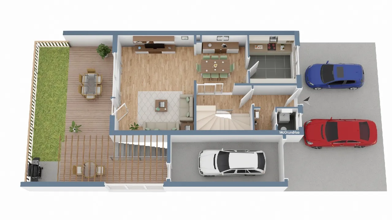 Bereits vor dem Haus erwarten Sie gleich drei praktische Außenstellplätze sowie eine seitlich angrenzende Garage mit direktem Zugang zum Garten.