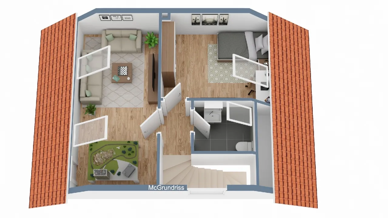 Dachform: Satteldach mit Zwischensparrendämmung, das Dachgeschoss ist wohnlich ausgebaut