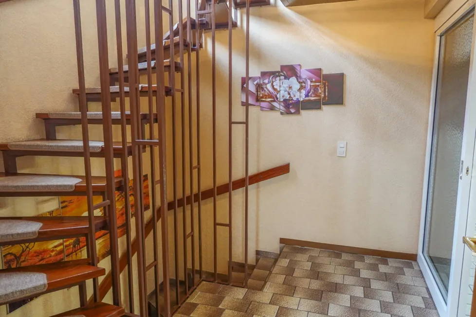 Im Inneren des Hauses betreten Sie zunächst ein praktischer Windfang mit angrenzendem Garderobenbereich und Zugang zum Gäste-WC mit Fenster. Vom angrenzenden Eingangsbereich führt der Treppenaufgang in alle Etagen sowie in den Vollkeller.