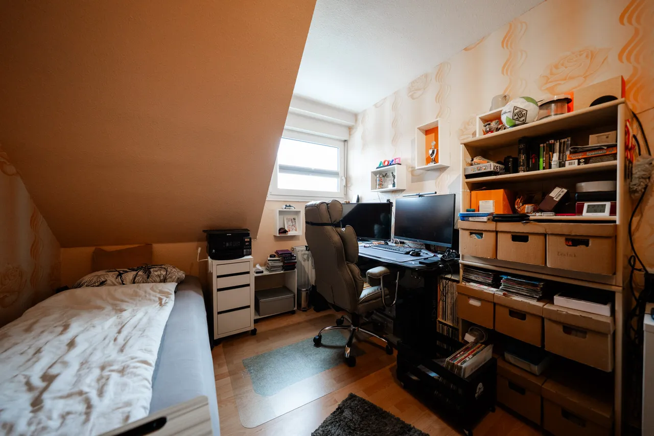 Im Obergeschoss entfaltet sich der private Bereich des Hauses. Das Schlafzimmer überzeugt durch seine ruhige, harmonische Atmosphäre. Das Tageslichtbad, 2011 modernisiert, ist mit Badewanne und Dusche praktisch und stilvoll ausgestattet. Ein weiteres Zimmer, über das Bad zugänglich, eignet sich ideal als Kinderzimmer, Gästezimmer oder Homeoffice. Das ausgebaute Dachgeschoss (nicht in der Wohnfläche enthalten) bietet zusätzlichen Raum für Hobbys, kreative Projekte oder einen persönlichen Rückzugsort.