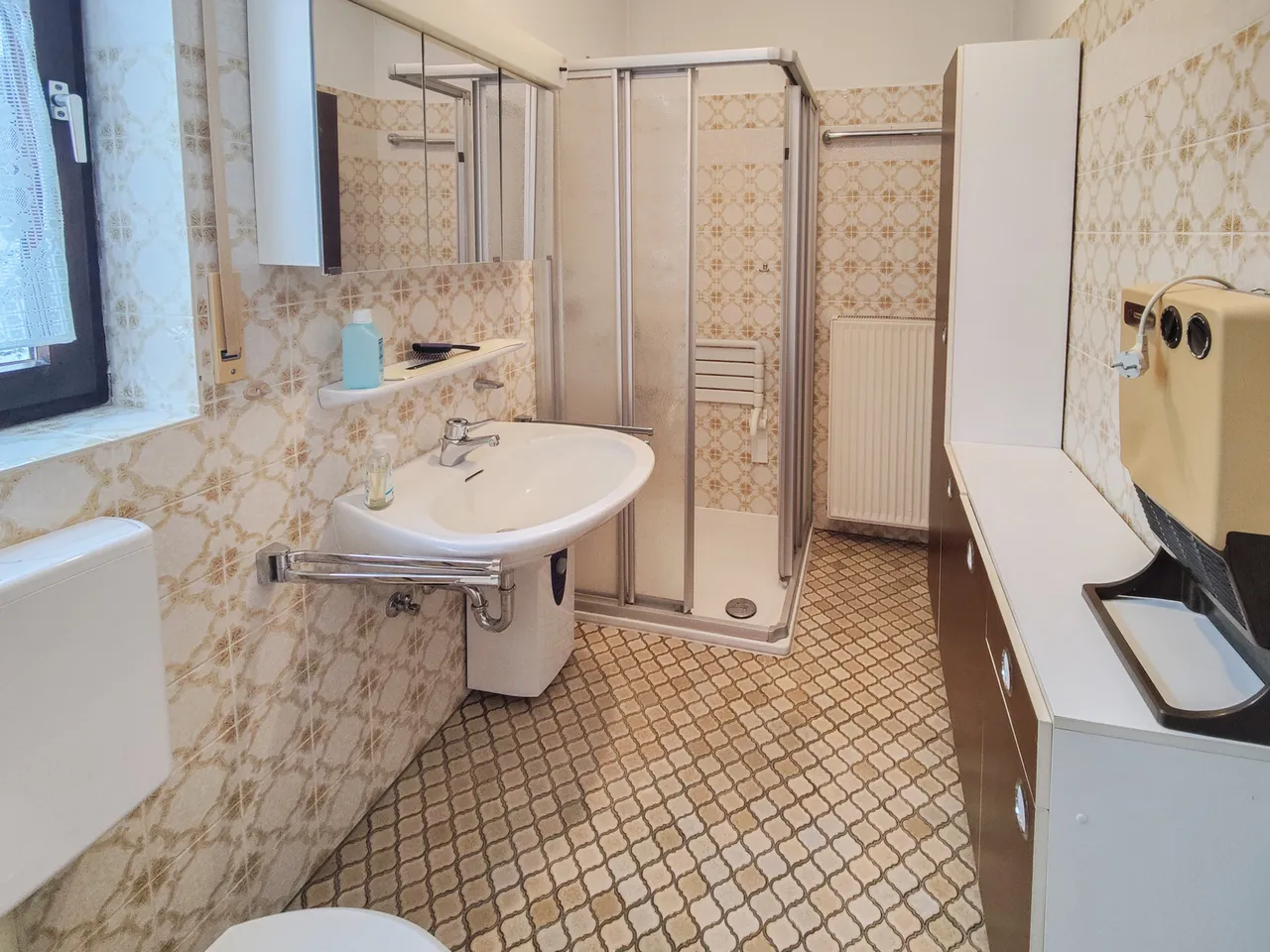 Die Beheizung des Gebäudes erfolgt über eine Öl-Zentralheizung von 1997. Diese sorgt auch, außer beim Bad im OG, für die allgemeine Warmwasserbereitung.