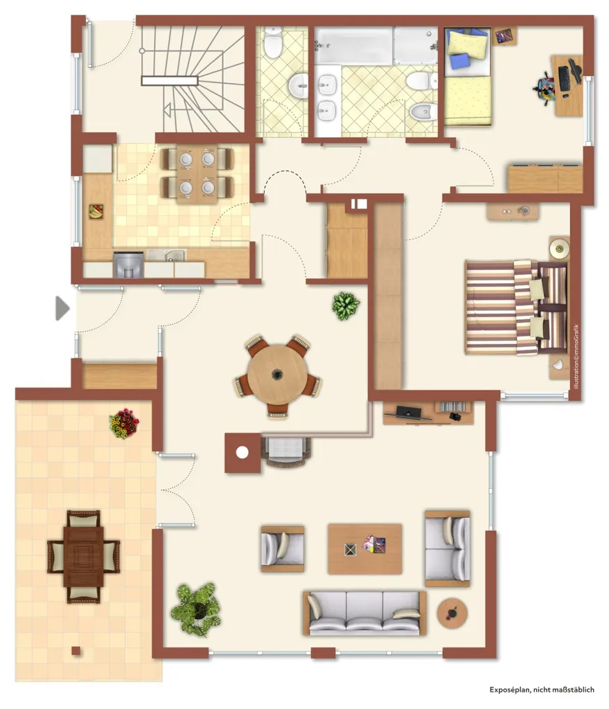 Im Erdgeschoss erwartet Sie eine großzügige Wohnküche, die zum gemeinsamen Kochen und Verweilen einlädt. Der lichtdurchflutete Essbereich geht nahtlos in das einladende Wohnzimmer über, das mit einem gemütlichen Kamin ausgestattet ist und direkten Zugang zur Terrasse bietet perfekt für entspannte Sommerabende im Freien. Hier finden Sie auch zwei behagliche Schlafzimmer, ein innenliegendes Badezimmer sowie ein praktisches Gäste-WC.