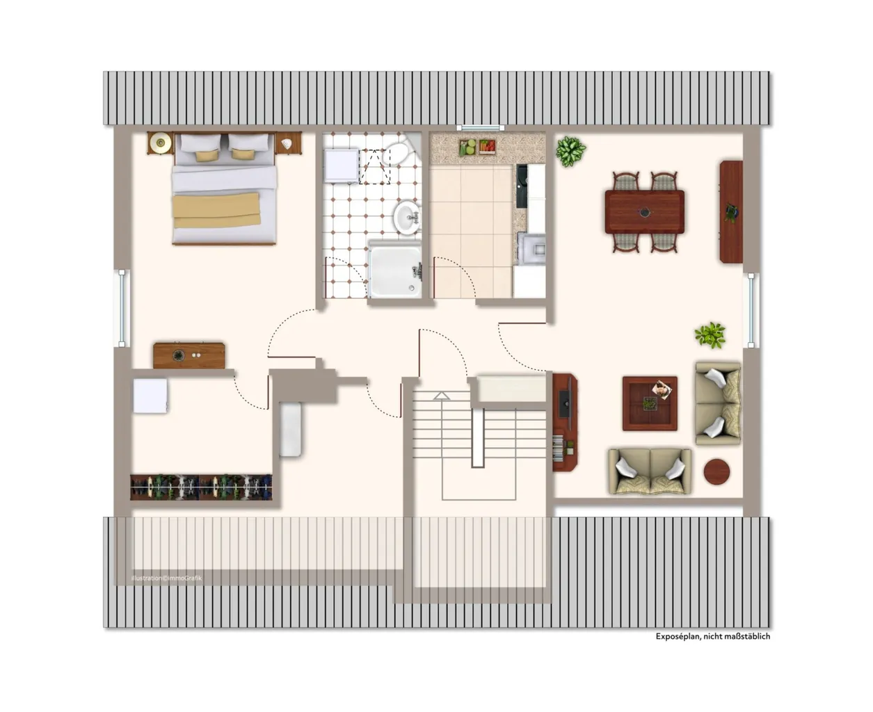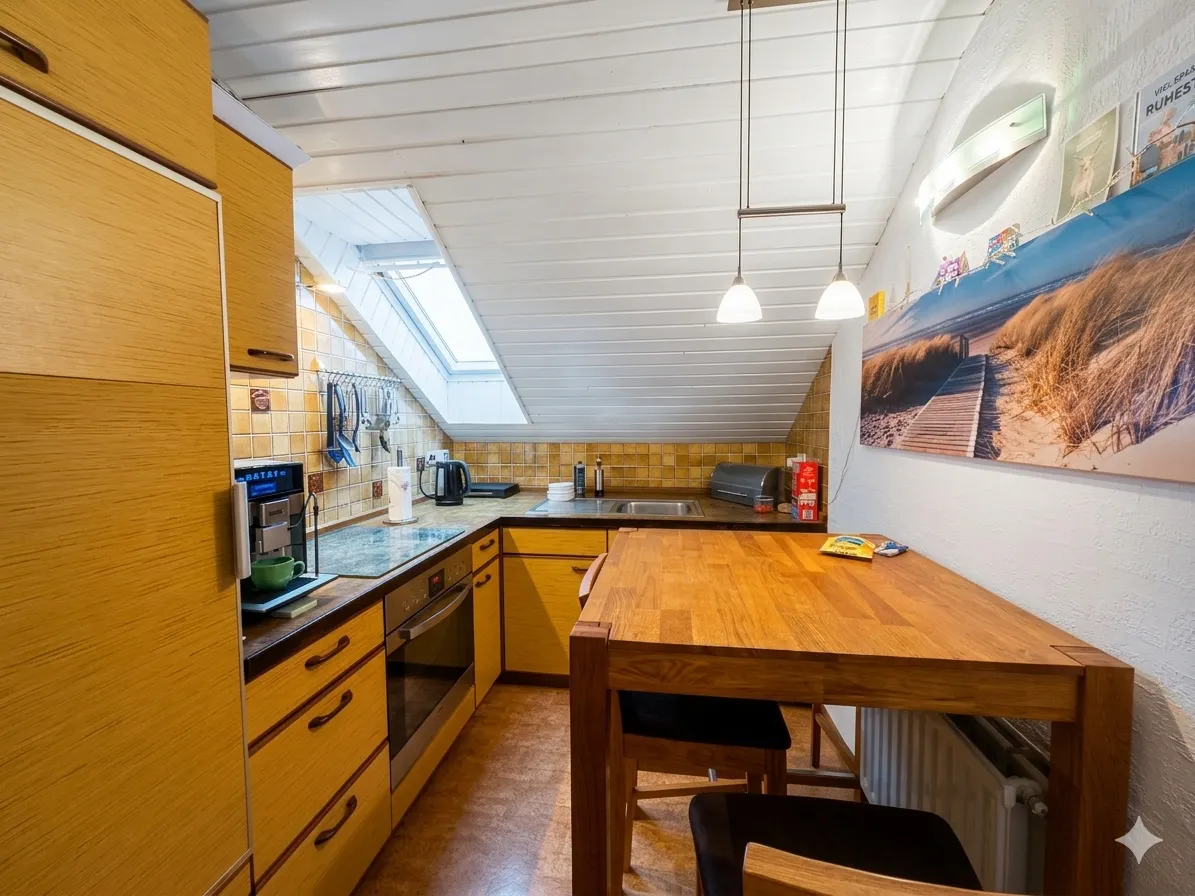 Das Dachgeschoss bietet zusätzlichen Wohnraum mit einem Schlafzimmer, einem Wohn- und Esszimmer, einer Küche und einem Badezimmer. Zwei Abstellräume sorgen für ausreichend Stauraum. Diese Fläche ist nicht in den Wohnfläche enthalten da hier keine Baugenehmigung vorliegt (also zusätzlich ca. 42 m²)