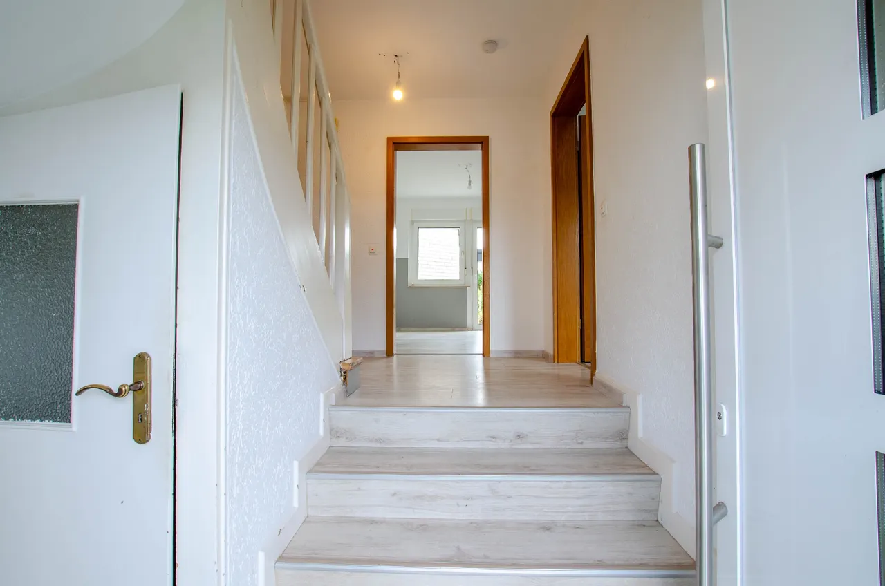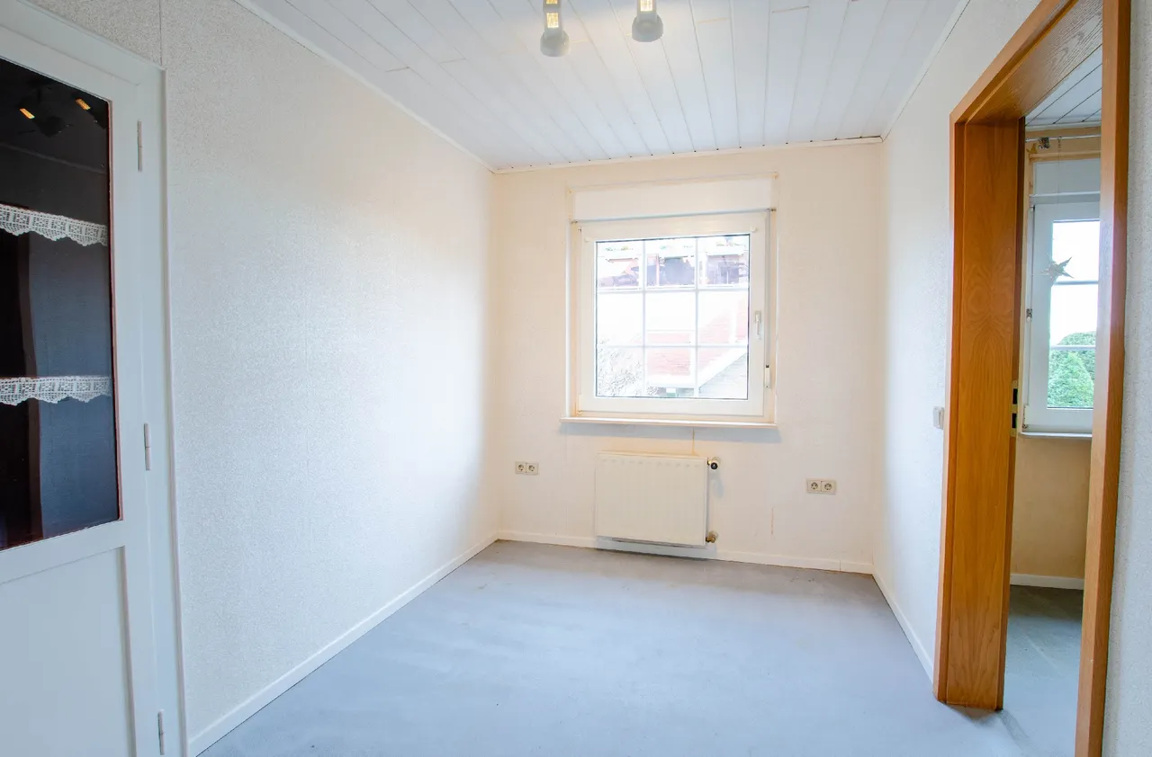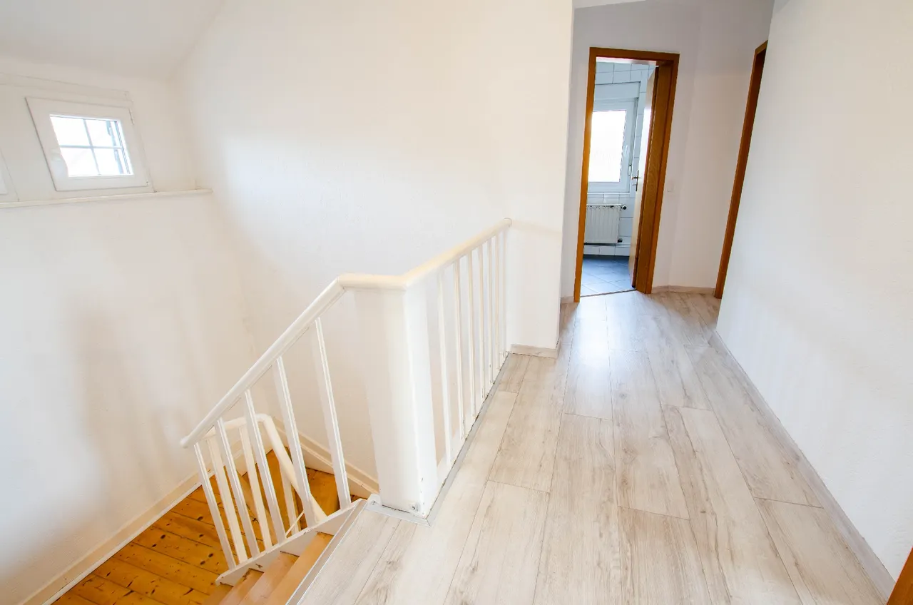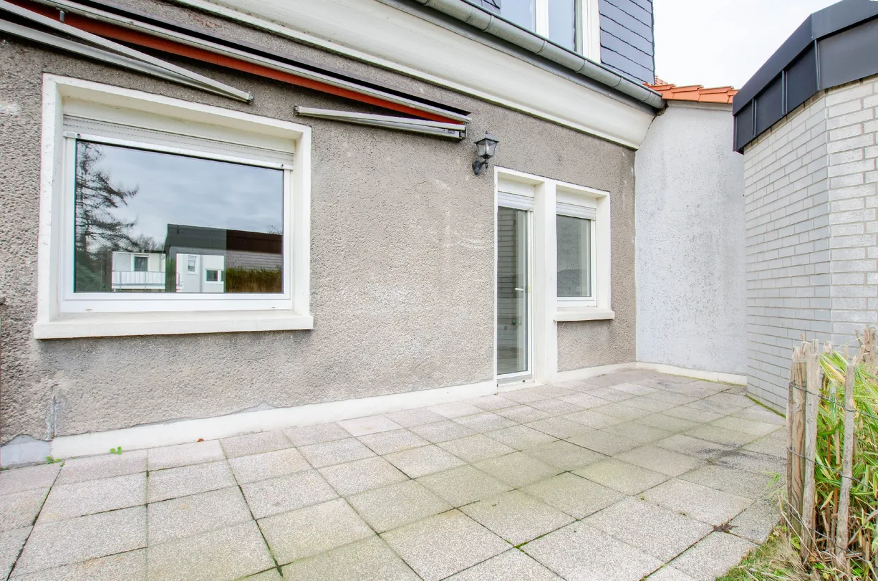 Willkommen in Ihrem zukünftigen Zuhause. Dieses charmante Einfamilienhaus aus dem Jahr 1950 bietet Ihnen auf zwei Etagen eine großzügige Wohnfläche von 133m². Die Immobilie verfügt über eine zweckmäßige Raumaufteilung mit lichtdurchflutetem Wohn- und Esszimmer als zentralen Bereich. Ergänzt wird das Raumangebot durch eine Küche, ein Schlafzimmer mit angrenzendem Ankleidezimmer sowie ein Gäste-WC im Erdgeschoss. Die Terrasse ist durch die Küche zu betreten, und ist der perfekte Ort, um die warmen Sonnenstrahlen zu genießen oder unvergessliche Grillabende mit Freunden und Familie zu verbringen. Das Obergeschoss bietet ideale Voraussetzungen für das Familienleben. Über den zentralen Flur sind alle Räume bequem erreichbar, wodurch eine klare und familiengerechte Trennung der Wohnbereiche entsteht. Es stehen mehrere gut geschnittene Zimmer zur Verfügung, die sich hervorragend als Schlaf- oder Kinderzimmer nutzen lassen. Ein weiteres Zimmer eignet sich ideal als Arbeits-, Gäste- oder Spielzimmer. Die flexible Raumstruktur erlaubt es, die Etage individuell an ihre Bedürfnisse anzupassen. Lassen Sie Ihrer Kreativität freien Lauf und verwandeln Sie diese einzigartige Immobilie in Ihr ganz persönliches Paradies. Es ist der perfekte Ort für all jene, die Platz, Ruhe und die Freiheit zur individuellen Gestaltung suchen. Kommen Sie vorbei und entdecken Sie das Potenzial, das in diesen Wänden steckt! Das Haus wird in Form eines Wohnungseigentums von der im Hinterland liegenden Immobilie separiert verkauft.