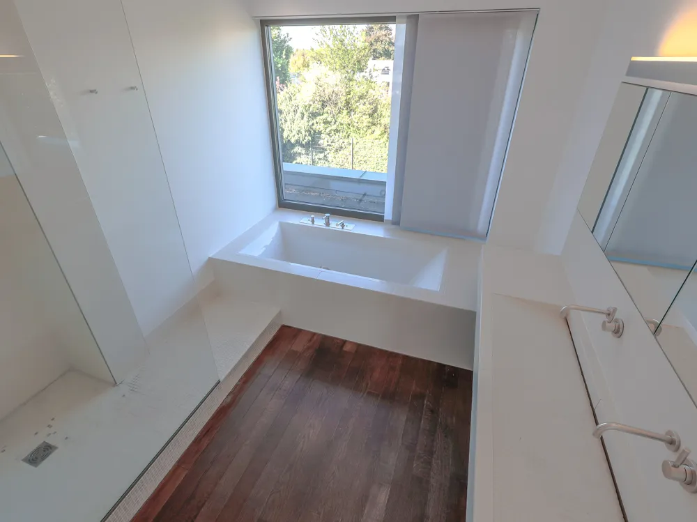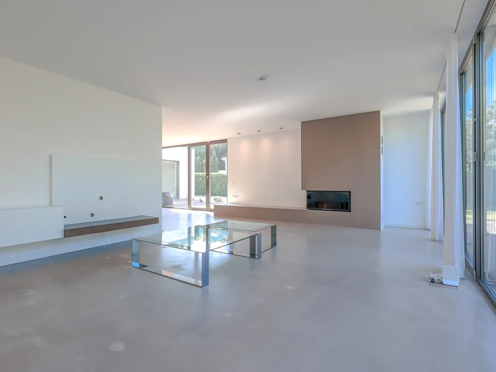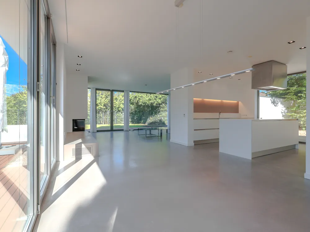 Das Haus erstreckt sich über Erd- und Obergeschoss und beeindruckt bereits beim Betreten mit seiner offenen, lichtdurchfluteten Gestaltung. Großzügige Glasflächen schaffen fließende Übergänge zwischen Innen- und Außenbereich, während hochwertige Materialien und ein fugenloser Boden ein modernes, harmonisches Gesamtbild erzeugen. Im Wohn- und Essbereich sorgt ein Kamin für behagliche Atmosphäre, während die offen gestaltete Küche mit Kochinsel, hochwertigen Einbauten und einem angrenzenden Vorratsraum überzeugt.