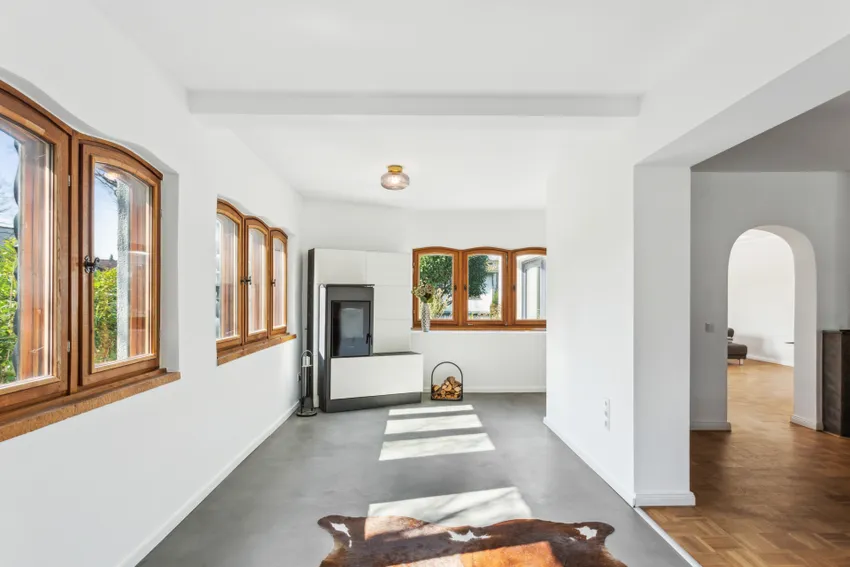 Ein Haus mit Charakter: Im Erdgeschoss erwarten Sie drei großzügige Räume, ein stilvolles Badezimmer sowie eine moderne, offene Küche. Das Herzstück bildet das elegante Kaminzimmer, das harmonisch an den Wohn- und Essbereich anschließt. Hier trifft nostalgisches Flair auf zeitgemäße Eleganz – aufgearbeitete Altholzfenster mit neuen Glaseinsätzen korrespondieren perfekt mit dem edlen Boden in Betonoptik. Für behagliche Wärme sorgt ein per Smartphone steuerbarer Hybrid-Kamin mit Pelletofen. Vom Wohn-, Küchen- und Kaminbereich aus gelangen Sie direkt auf zwei der insgesamt drei Terrassen – ideale Orte zum Entspannen, Grillen oder für gesellige Stunden im Freien.