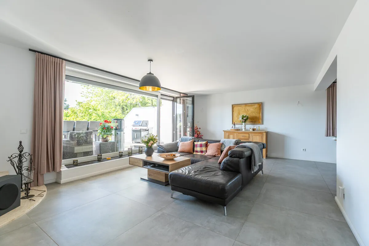 Der elegante Eingangsbereich heißt Sie herzlich Willkommen! Der Wohn-Essbereich lässt durch seine außergewöhnlich großen Fenster die Sonne hinein und bietet Ihnen einen himmlischen Blick in Ihren Traumgarten. Lange Verweilen mit der Familie lässt es sich vor dem gemütlichen Kamin. Direkt nebenan befindet sich der Küchenbereich mit Blick in den Vorgarten. Perfekt passend zum modernen Interieur erwartet Sie hier eine schöne Einbauküche, die sogar schon im Kaufpreis enthalten ist! Besonders ansprechend ist auch das individuelle Duschbad, welches durch die bodentiefe XXL-Dusche und ausgefallenes Design besticht. Für den Besuch wurde selbstverständlich auch an ein Gäste- WC gedacht. Gleich zwei großzügige Schlafzimmer mit Blick in den Garten ermöglichen das 100 %ige Wohnen auf einer Ebene. Absolutes Highlight ist außerdem der beheizbare Wintergarten, der aktuell als Büro genutzt wird. Hier hält man sich zu jeder Jahreszeit gerne auf!