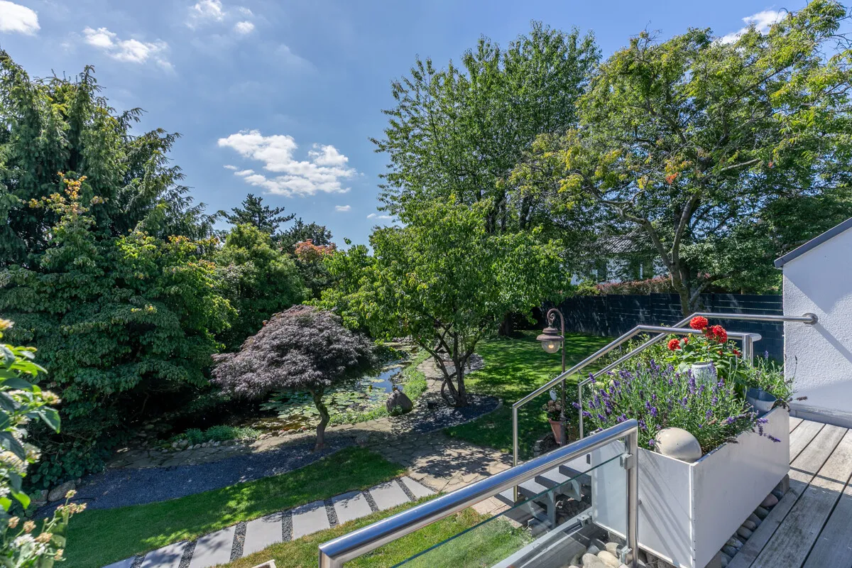 In diesem wunderschönen Garten mit großer Teichanlage können Sie entweder entspannen oder aktiv werden! Auf den beiden traumhaften Terrassen kann man ausgiebig relaxen und die Seele baumeln lassen. Der herrliche Garten bietet noch jede Menge Freiraum für Ihren grünen Daumen. Hier ist für jeden etwas dabei!