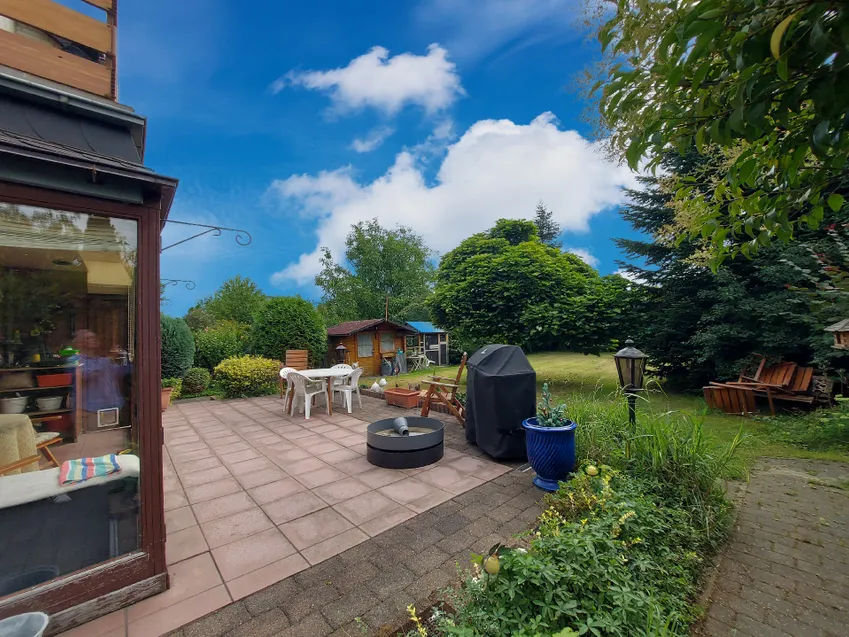 Der große Garten bietet zahlreiche Gestaltungsmöglichkeiten ob für Spiel und Freizeit, Gemüseanbau oder entspannte Stunden im Grünen. Die Terrasse lädt zum Verweilen ein, während der praktische Windfang für zusätzlichen Komfort und Wetterschutz sorgt.