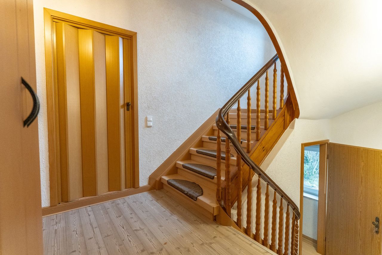 Beim Betreten der Wohnung empfängt Sie ein Eingangsbereich mit Garderobe, Abstellkammer sowie Zugang zur Diele im 1. Obergeschoss und zum Treppenaufgang in das 2. Obergeschoss.