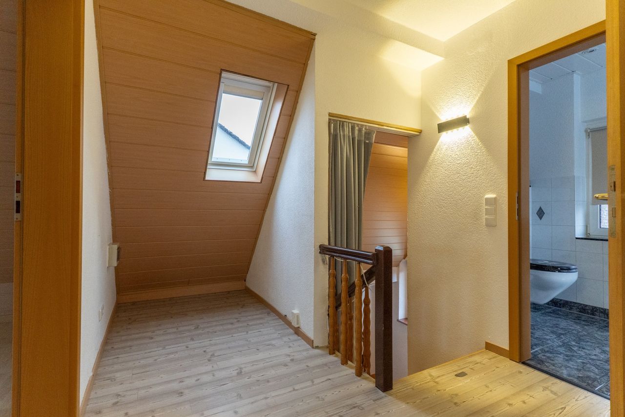 Über die Treppe im Eingangsbereich gelangen Sie in das 2. Obergeschoss. Die Diele auf dieser Ebene bietet Platz für einen kleinen Arbeitsbereich und erschließt alle weiteren Räume sowie den Zugang zum Spitzboden, der zusätzliche Abstellfläche zur Verfügung stellt.