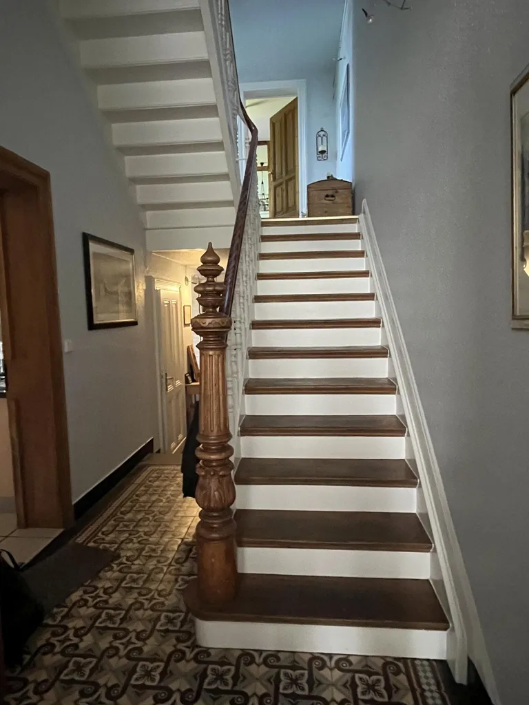 Über eine schöne Holztreppe gelangt man ins Obergeschoss mit Schlafzimmer, Balkon, Duschbad, Kinderzimmer, einem gefangenen Raum (z. B. Büro oder Ankleide) sowie einem großen Arbeitszimmer im Anbau.
