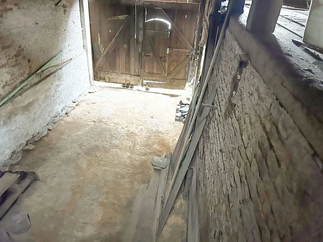 Die historische Scheune nimmt zwei Drittel der Gesamtfläche ein. Sie ist aus robustem Backstein gebaut und verfügt über ein charmantes Satteldach , das mit Dachpfannen eingedeckt ist. Der Boden der Scheune besteht teilweise aus Natursteinpflaster und Lehmboden, was dem Ambiente eine rustikale Eleganz verleiht. Die Fenster sind einfachverglast. Anschlüsse für Strom und Kanal sind an der Straße vorhanden.