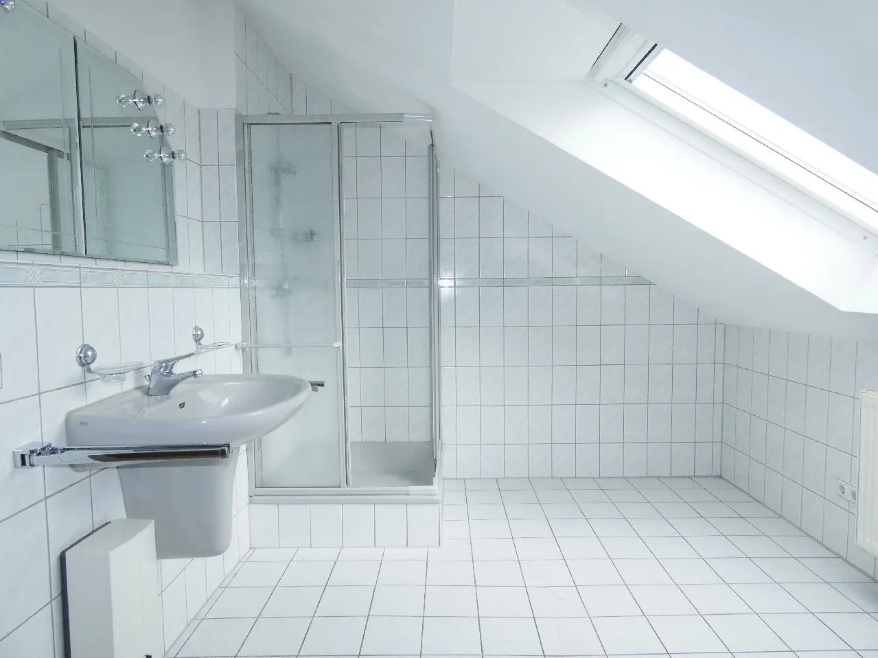 Über eine stilvolle Stahltreppe gelangen Sie von der Diele in das Dachgeschoss. Dort erwartet Sie ein helles Duschbad mit Anschlüssen für Waschmaschine und Trockner sowie eine praktische Abstellkammer. Das großzügige Schlafzimmer überzeugt trotz der Dachschrägen mit ausreichend Platz für ein großes Bett und bietet zudem einen idealen Bereich für einen geräumigen Kleiderschrank.