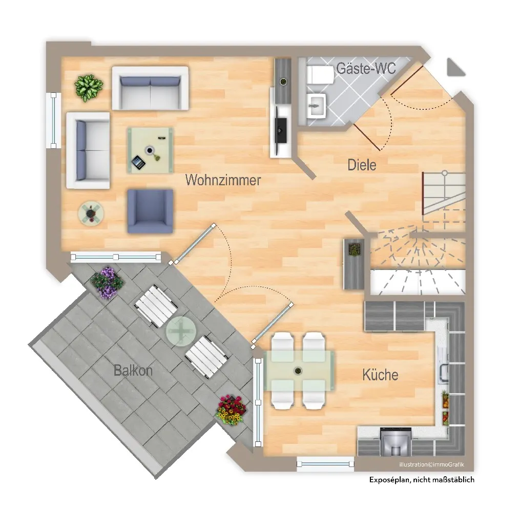Bereits beim Betreten der Wohnung eröffnet sich ein ansprechender Blick von der Diele in den Wohnbereich, der durch einen stilvollen Rundbogen zusätzlich unterstrichen wird. Unter der Treppe befinden sich praktische Abstellmöglichkeiten, die wertvollen zusätzlichen Stauraum bieten. Ergänzt wird diese Ebene durch ein Gäste-WC.
