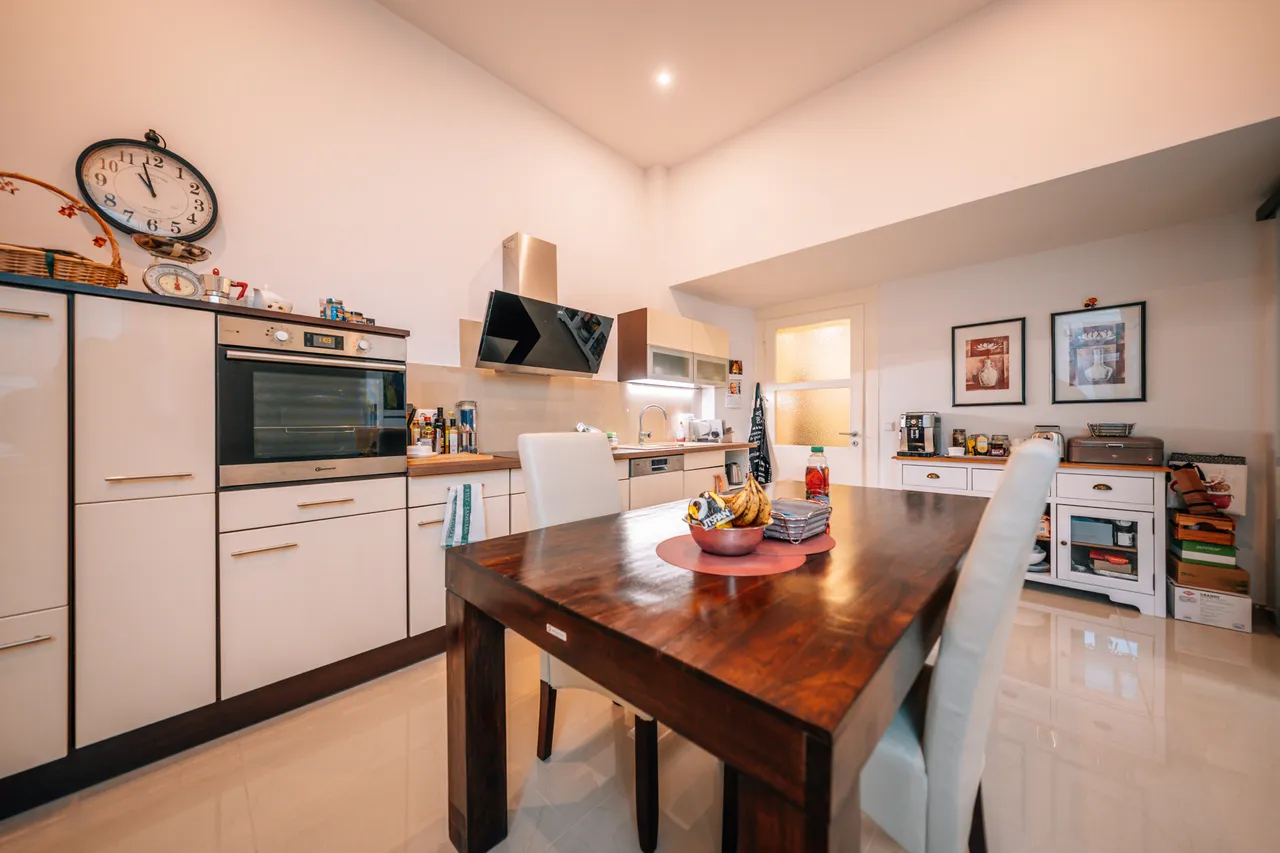 Der Wohn- und Essbereich entfaltet sich offen und kommunikativ – ein Raum, der sowohl zum Ankommen als auch zum Bleiben einlädt. Licht fällt großzügig durch die hohen Fensterflächen, fließt weiter in die Küche, die mit ihrer Nähe zum Essbereich eine natürliche Verbindung schafft.