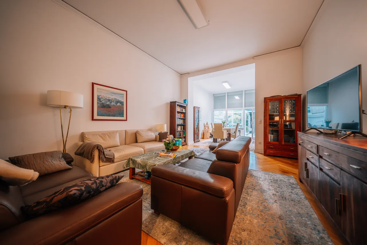 Die rund 99 Quadratmeter Wohnfläche öffnen sich großzügig und hell. Hohe Decken, elegante Raumproportionen und eine klare Grundstruktur verleihen der Wohnung ihre zeitlose Wirkung. Aktuell in zwei weitläufige Zimmer aufgeteilt, lässt sie sich mit wenig Aufwand zu einer Drei-Zimmer-Wohnung umgestalten – ganz nach Ihren Bedürfnissen und Lebenskonzepten.