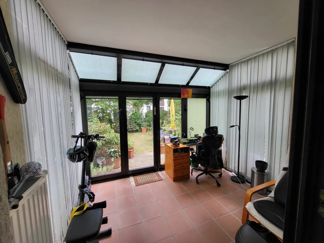 Besonders charmant ist die überdachte Terrasse, die an den Seiten und nach vorne offen ist und direkt vom Wohnzimmer über eine Glastür zugänglich ist. Hier lässt sich der Garten an sonnigen Tagen genießen - sei es zum Frühstück, zum Lesen oder für gesellige Stunden im Freien.