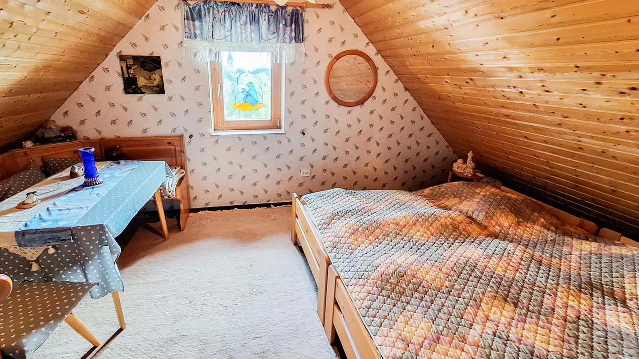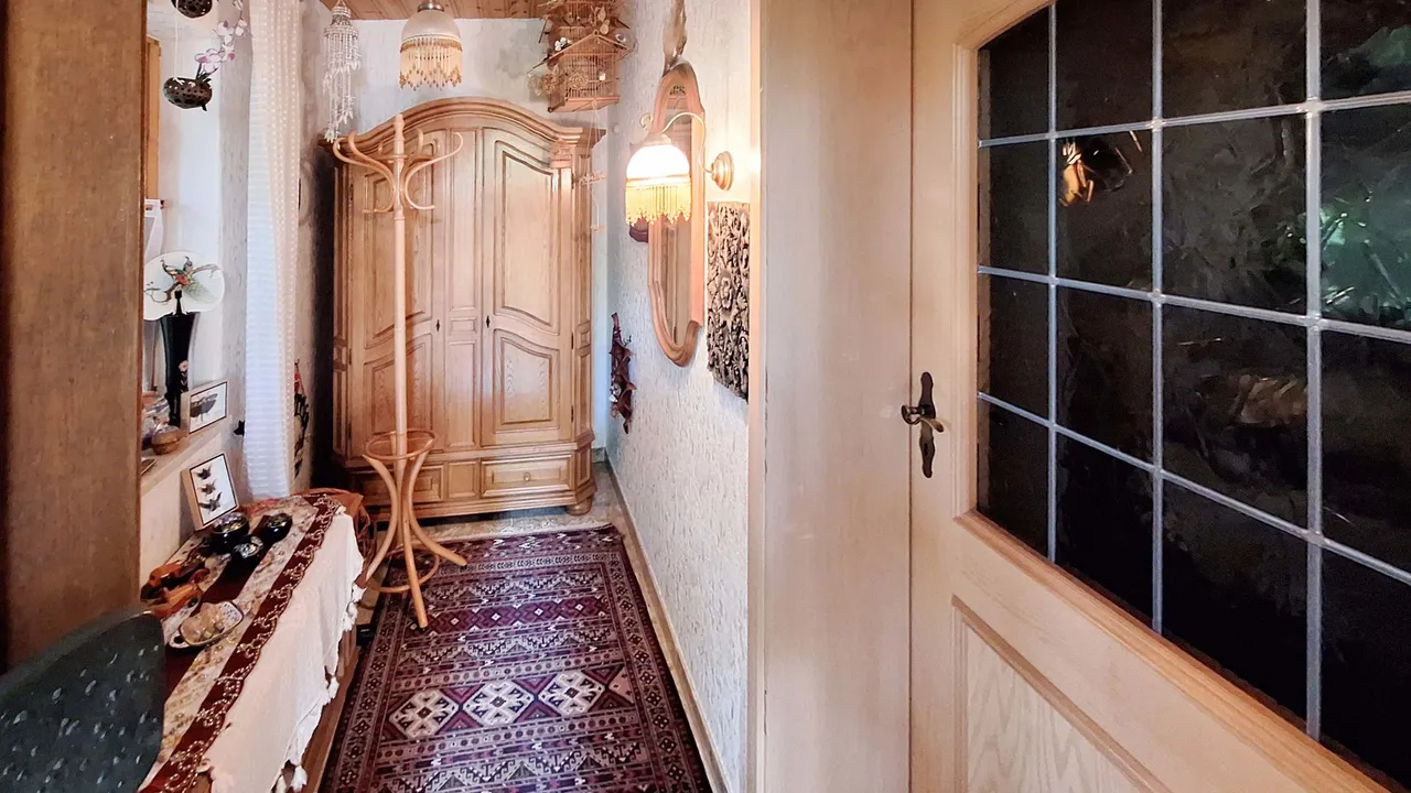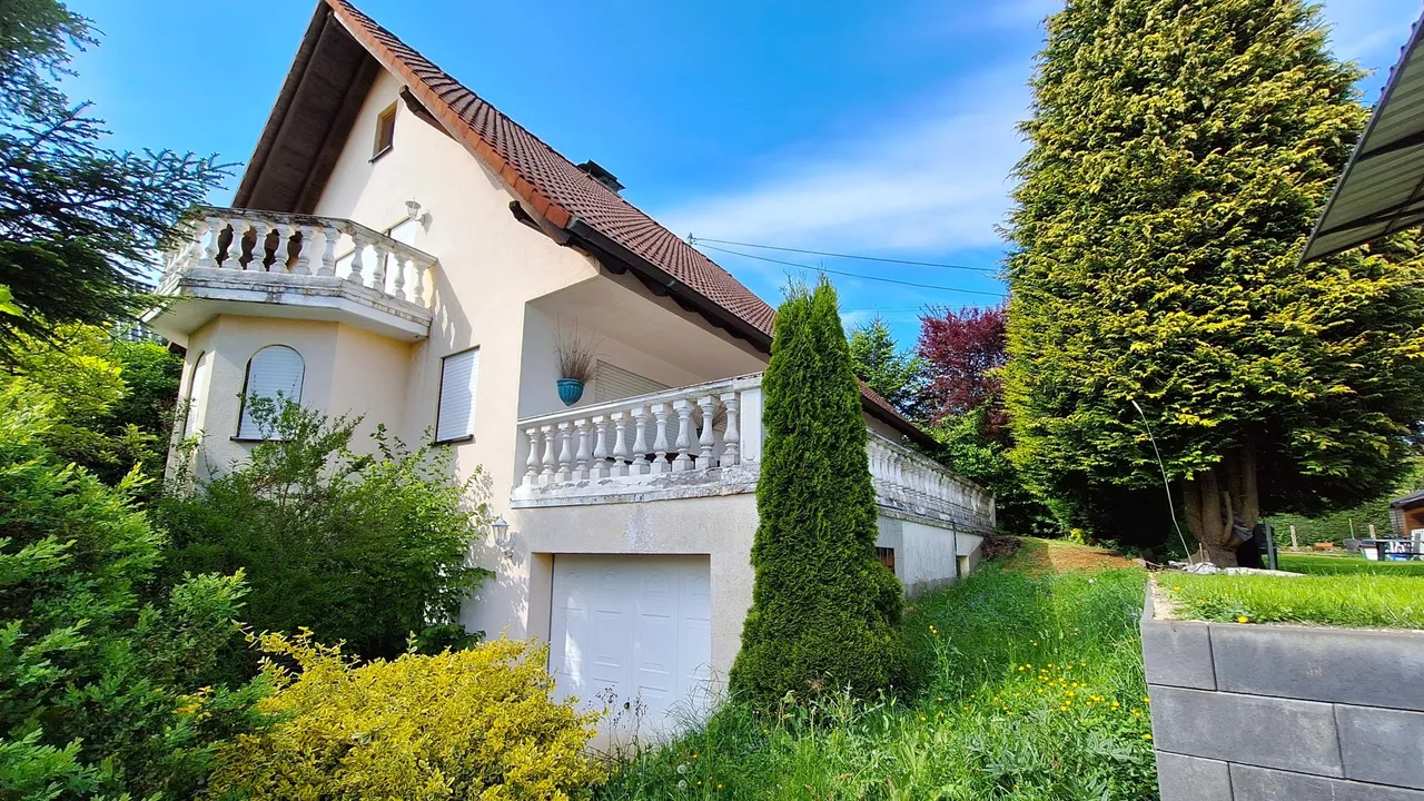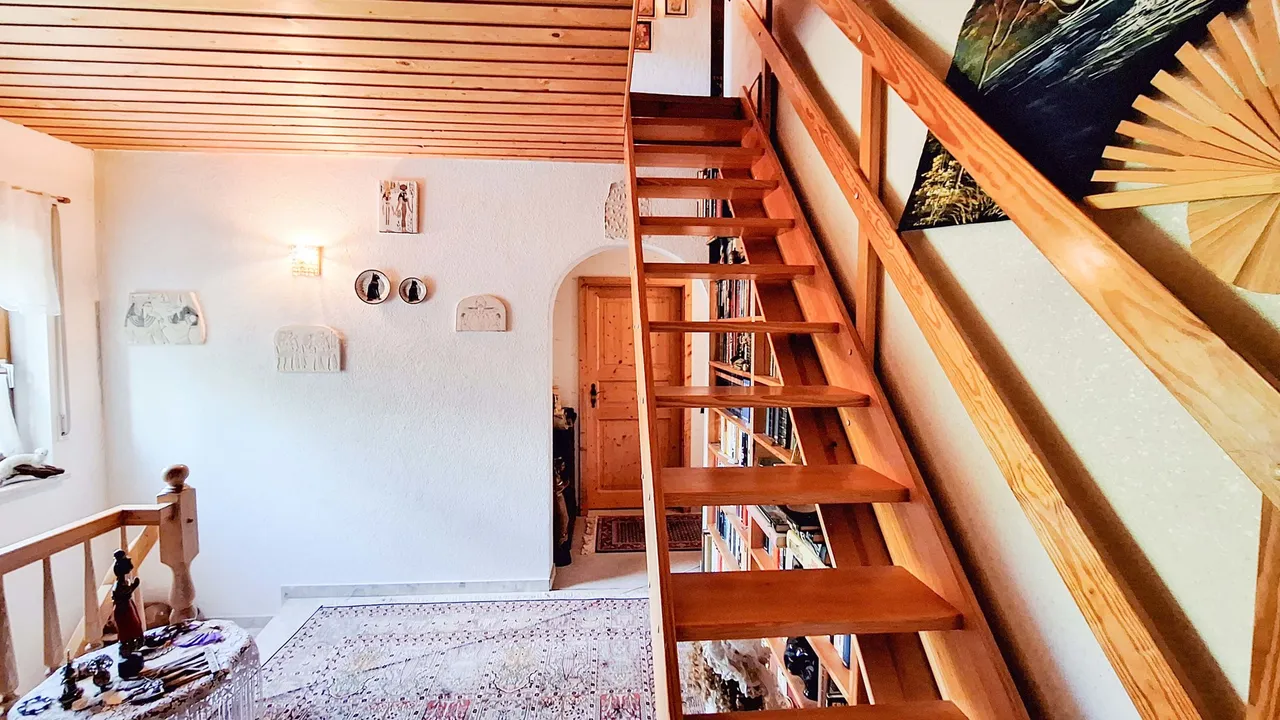 Im Obergeschoss befinden sich zwei Schlafzimmer, ein Badezimmer sowie ein Balkon. Der ausgebaute Spitzboden bietet zwei weitere, vielseitig nutzbare Zimmer. Der ebenerdig gelegene Keller überzeugt mit direktem Zugang zur Garage, einer Waschküche mit integrierter Sauna, zwei beheizten, ausgebauten Zimmern sowie einem praktischen Hauswirtschaftsraum. Das Wohnzimmer des Kellergeschosses verfügt über einen gemütlichen Kachelofen. Ein ideales Zuhause für Familien mit Platzbedarf!