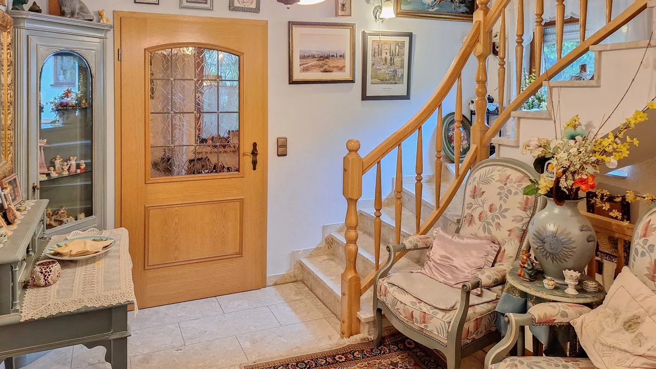 Im Erdgeschoss gelangen Sie über den Windfang in den Flur, von dem aus sich Küche und das großzügige Wohn- und Esszimmer mit Erker erschließen. Beide Räume bieten Zugang zur sonnigen Terrasse – ideal für entspannte Stunden im Freien. Der gepflegte Garten mit Pavillon und Gartenhaus lädt zum Verweilen ein.