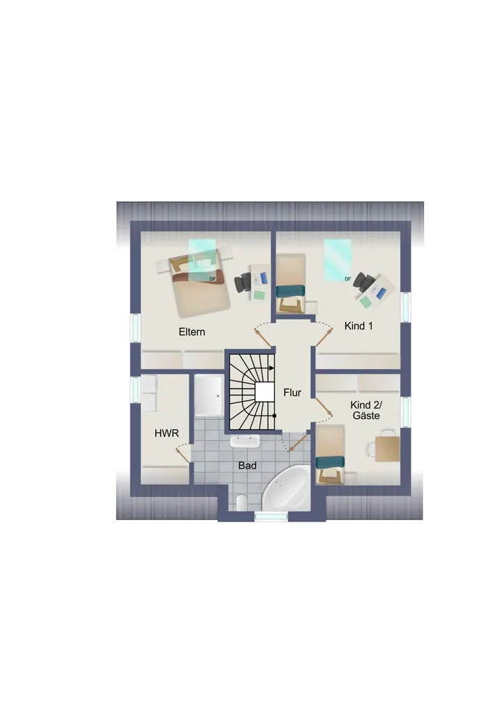 Die insgesamt vier Schlafräume befinden sich im Obergeschoss und ausgebautem Dach und verfügen teils über Klimaanlagen. Im Obergeschoss ist auch das große Tageslichtbad mit Eckwanne und großer Dusche sowie ein HWR mit Anschluss für eine Waschmaschine.