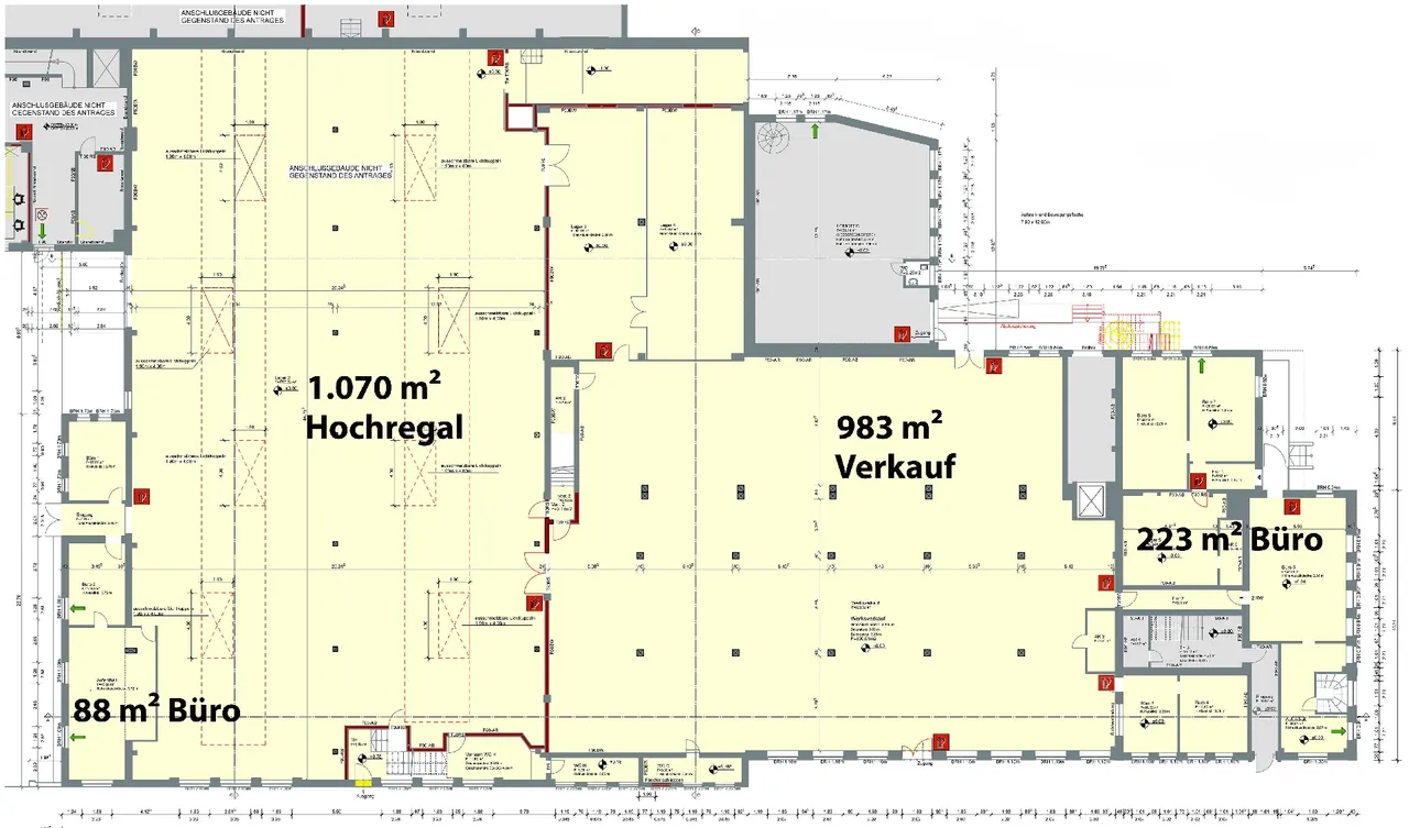 Das Objekt wird heute als Verwaltung und zum Verkauf von Gartenmöbeln genutzt. Die Verkaufsfläche ist 983 m² groß und verfügt über eine Höhe bis zur abgehangenen Decke von 3,50m. Hier lassen sich Ihre Waren perfekt präsentieren. Die Fläche kann natürlich auch als Produktionsfläche genutzt werden. Bestückt wird die Halle über eine Lieferrampe. Zusätzlich gibt es einen Eingang zur Verwaltung und einen getrennten Eingang in die Verkaufsfläche. Die anschließenden 233 m² Bürofläche runden das Gesamtangebot dieser Immobilie ab. Diese sind ebenfalls sehr modern und hell gestaltet und verfügen über heutige Technikstandards.