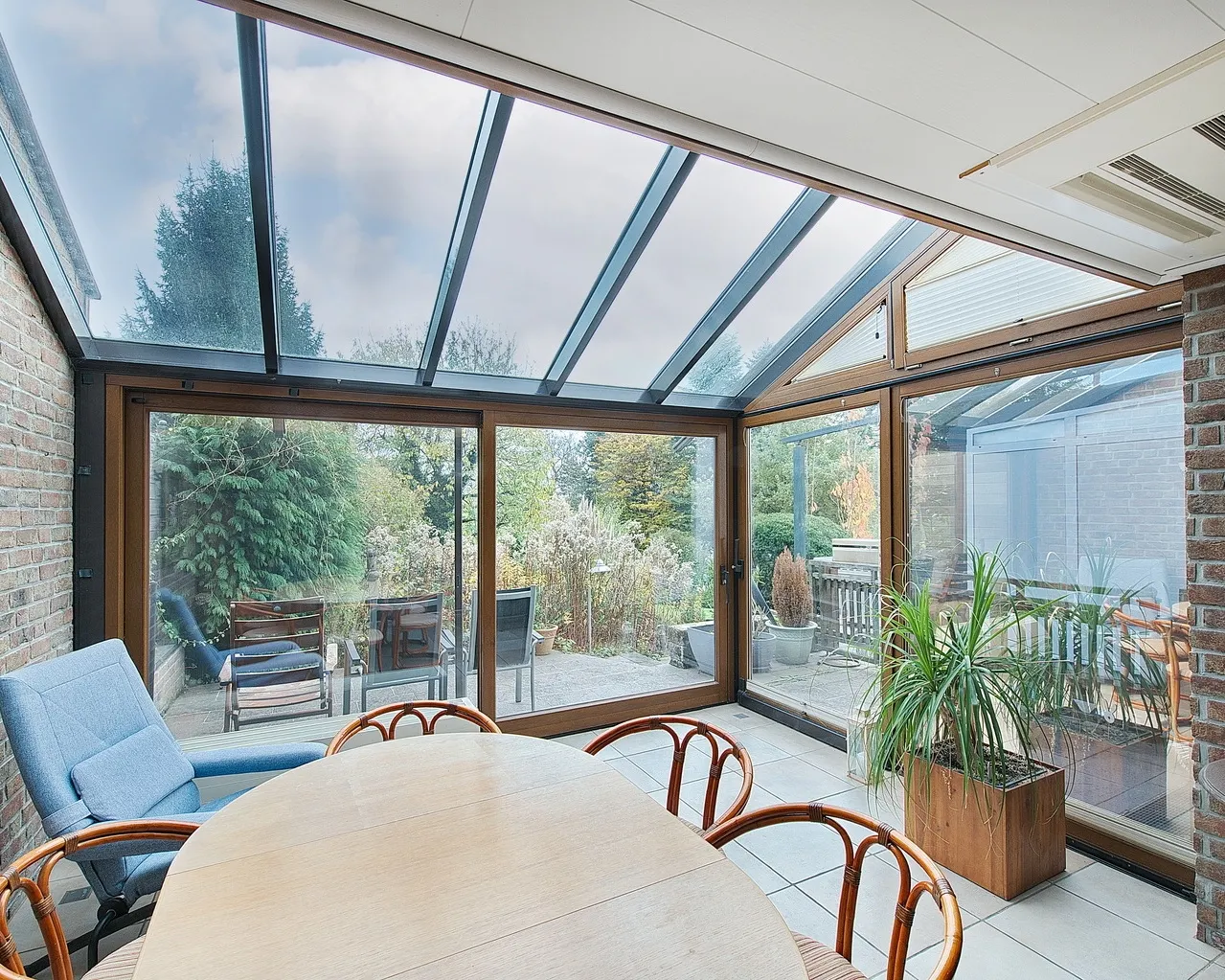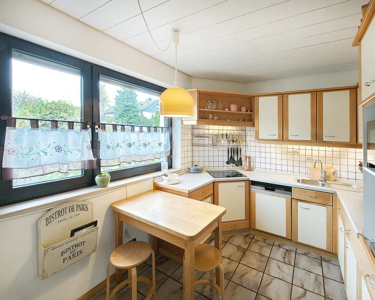 Im klassisch aufgeteilten Erdgeschoss befinden sich Küche, Gäste-WC sowie das geräumige Wohn-Esszimmer, das im Jahr 2006 um einen Wintergarten erweitert wurde. Dieser bietet Zugang zur angrenzenden Terrasse und zum südlich ausgerichteten Garten. An kalten Winterabenden sorgt ein Kamin im Wohnbereich für eine behagliche Atmosphäre.