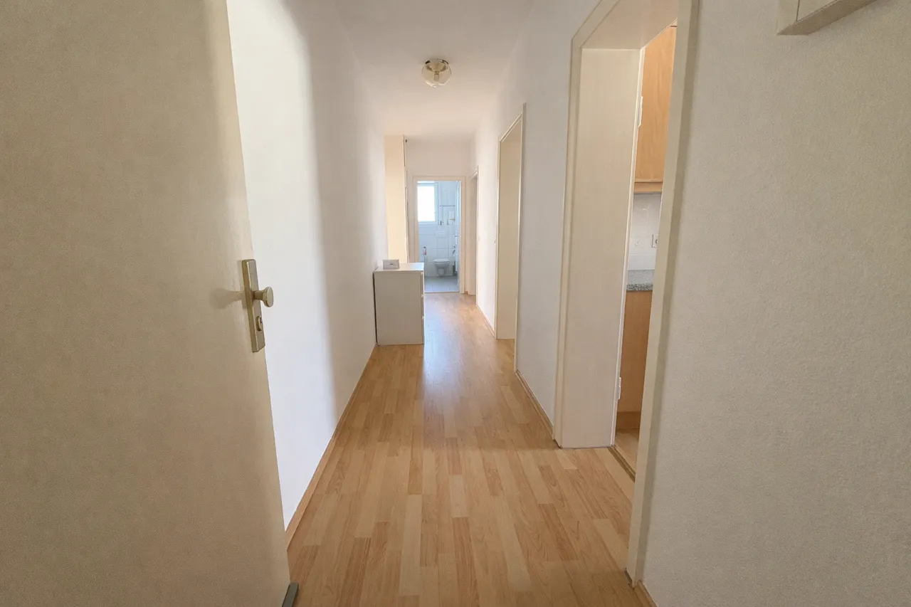 Diese 3-Zimmerwohnung befindet sich im ersten Obergeschoss eines Mehrfamilienhauses mit 6 Wohneinheiten und erstreckt sich über ca. 60 m² Wohnfläche. Es stehen Ihnen ein großer Wohnbereich mit Zugang zum Balkon sowie große Küche mit angrenzender Speisekammer, Bad und zwei Schlafräume zur Verfügung. Die Oberböden bestehen aus Laminat und Fliesen. Das hellgeflieste Bad verfügt über in Fenster und eine Badewanne. Die Wohnung wird über eine Gastherme beheizt, sodass Sie mit dem Versorger Ihrer Wahl einen Gasvertrag schließen können.