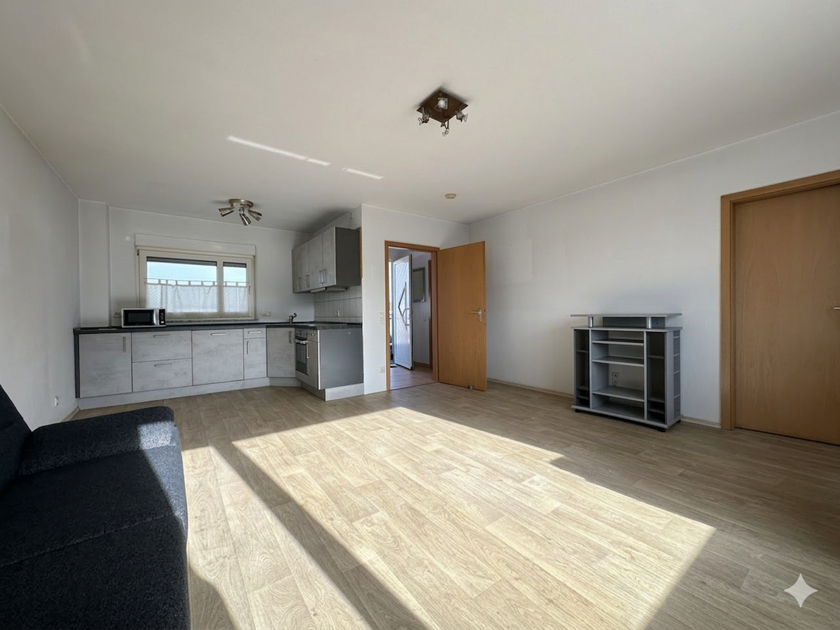Die Wohnung besticht durch eine großzügige Raumaufteilung. Der offene Küchenbereich mit Küchenbereich fügt sich nahtlos in den Wohnbereich ein. Der Schlafraum bietet gute Stellmöglichkeiten, und das Badezimmer ist sowohl mit Wanne als auch Dusche ausgestattet, inklusive Platz für eine Waschmaschine. Ein ein Abstellraum und ein einladender Eingangsbereich runden das Raumangebot ab. Hochwertige Fliesen und Laminatböden verleihen der Wohnung eine moderne Ausstrahlung.