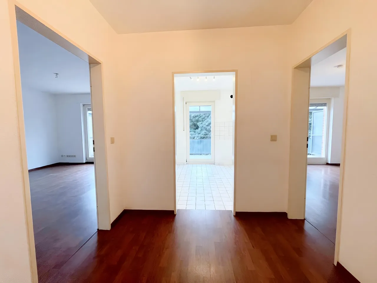 Der zentrale Dielenbereich verbindet alle Räume und bietet dank Einbauschränken praktischen Stauraum. Das lichtdurchflutete Wohnzimmer sowie die separate Küche ebenfalls mit Zugang zum Balkon schaffen ein angenehmes Wohngefühl. Der außergewöhnlich breite, teilweise überdachte Balkon lädt zu entspannten Stunden im Freien ein.