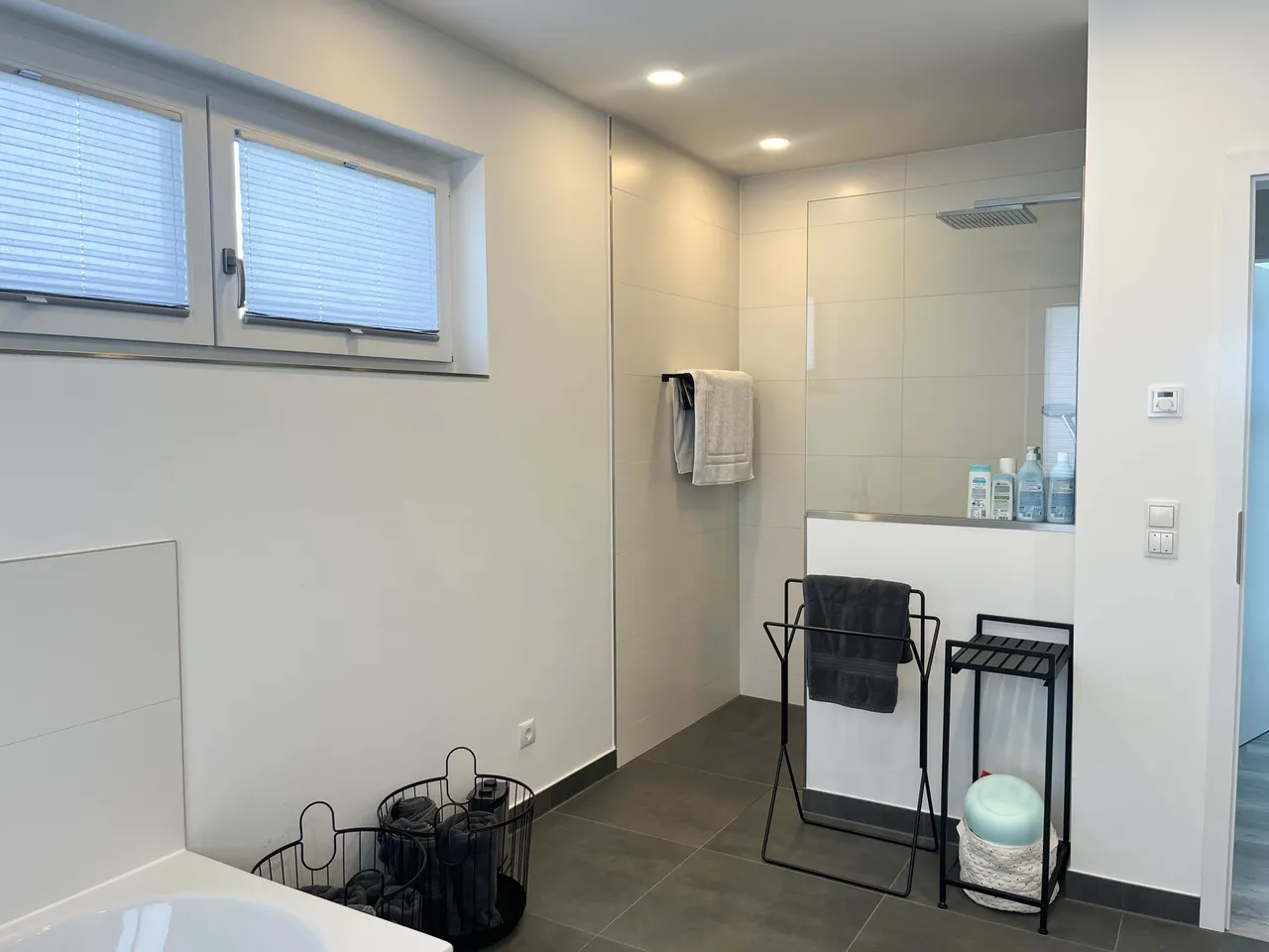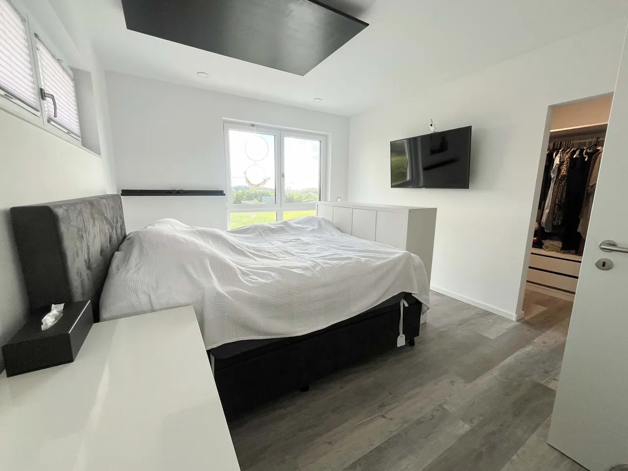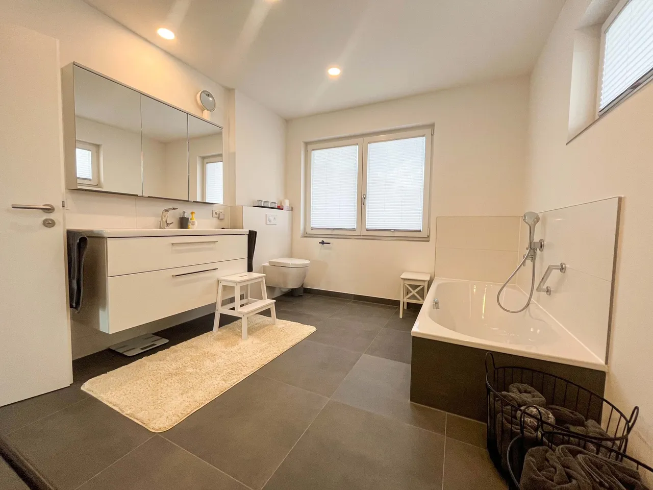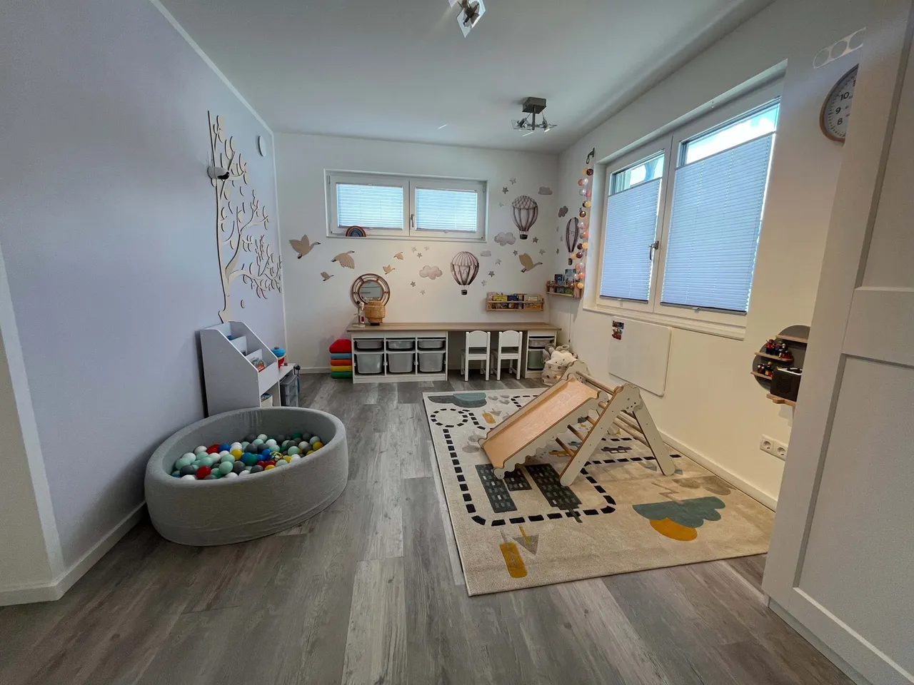 Im Obergeschoss erwarten Sie zwei Kinderzimmer, ein Schlafzimmer mit angrenzendem Ankleidezimmer, ein großzügiges Badezimmer mit Badewanne und Dusche sowie ein zusätzlicher Fitnessraum. Damit bietet das Haus ideale Voraussetzungen für Familien, die Wert auf Funktionalität und Komfort legen.