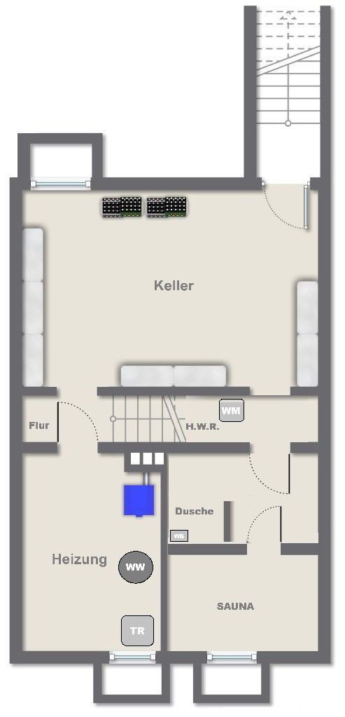 Im Kellergeschoss befinden sich ein Heizungskeller mit Hausanschlüssen, ein großer Kellerraum mit Ausgang zum Garten, zudem unter der Treppe der Anschluss für eine Waschmaschine sowie im weiteren Verlauf eine Sauna mit separater Dusche.