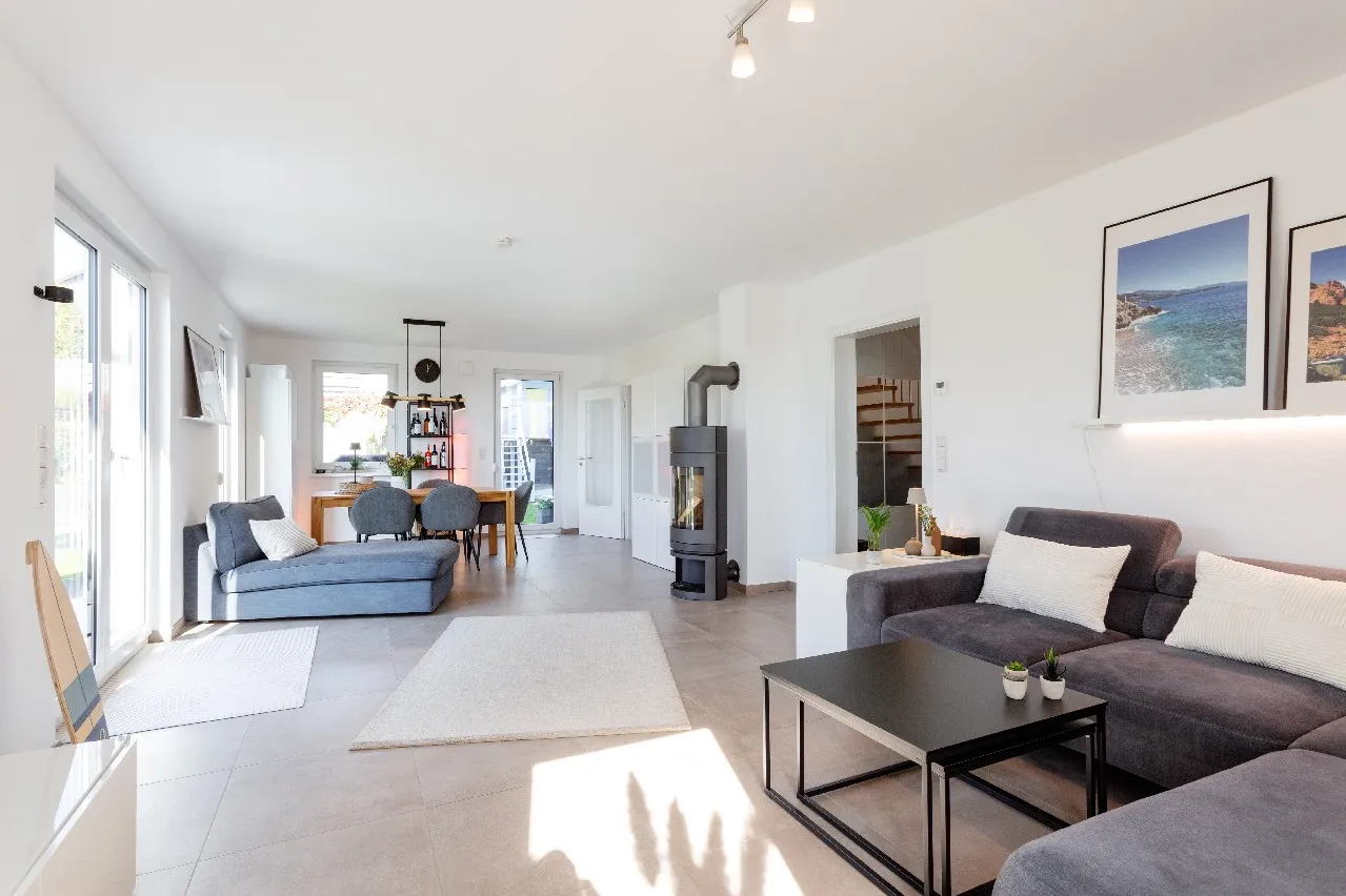 Helle großformatige Fliesen im gesamten Erdgeschoss