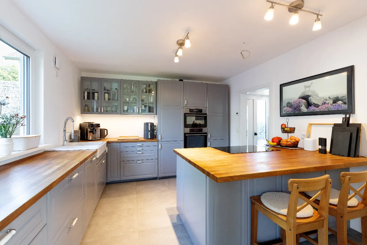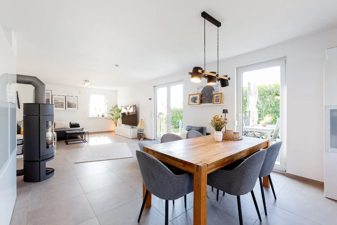Auf ca. 139 m² Wohnfläche finden sich helle und gut geschnittene Räume, die durch große Fensterfronten lichtdurchflutet sind. Die großformatigen Fliesen in allen Wohnbereichen, die weißen Türen mit Zargen sowie die bodentiefen Fensteranlagen mit Rollläden verleihen dem Wohnbereich einen besonderen modernen Look. Die Küche ist sowohl von der Diele als auch vom Essbereich erreichbar. Eine funktionelle Einbauküche mit Kochinsel im Landhausstil könnte vom Erwerber übernommen werden. Somit kann das kulinarische Abenteuer im Haus sofort beginnen.