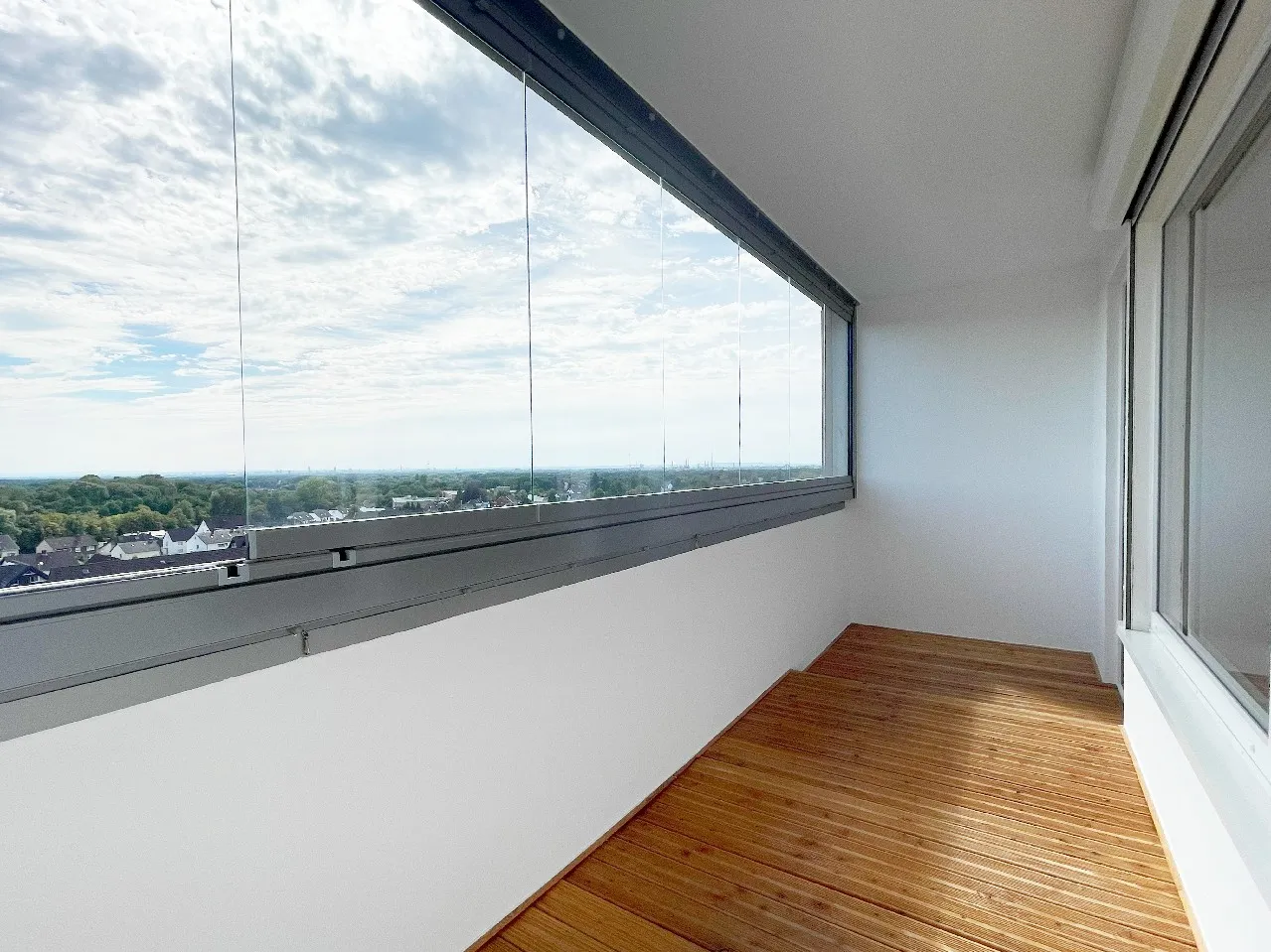 - Loggia mit neuem Bodenbelag und aufwendigem Windschutz aus Glas