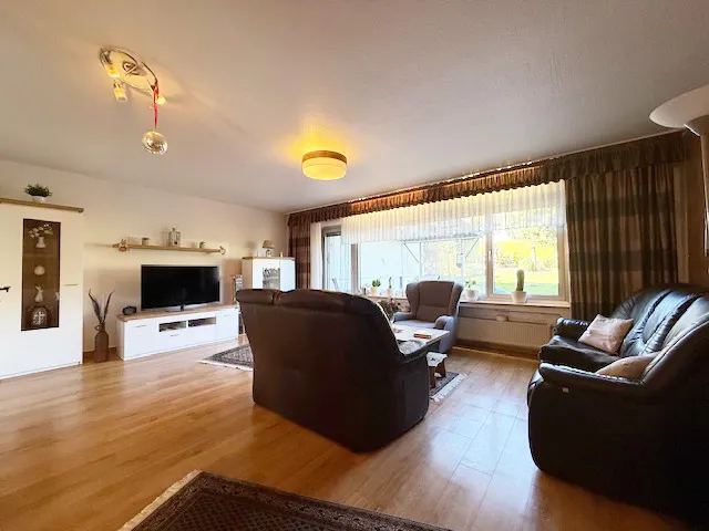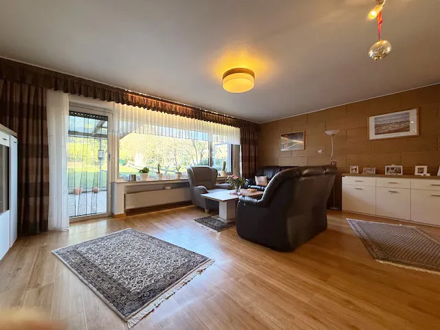 Im Erdgeschoss bildet der großzügige Wohn- und Essbereich mit ca. 36 m² das Herzstück des Hauses. Große Fenster sorgen für eine angenehme Lichtatmosphäre und einen schönen Blick in den Garten.