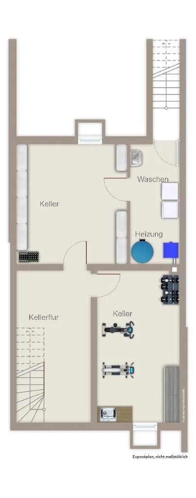 Das Haus ist vollständig unterkellert und bietet neben dem großen Flurbereich, einen Hobbykeller, einen Vorratsraum sowie eine Waschküche mit Ausgang in den Garten.