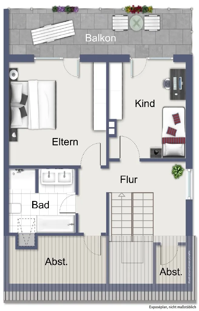 Im Dachgeschoss des Hauses stehen Ihnen zwei mögliche Schlafräume zur Verfügung, von denen Sie jeweils den gartenseitigen Balkon erreichen. Hinzu kommen ein Dusch- und Wannenbad sowie der Flurbereich im Dachgeschoss, der noch Platz für einen kleinen Arbeitsbereich bietet und über ein giebelseitiges Fenster auch gut belichtet wird.