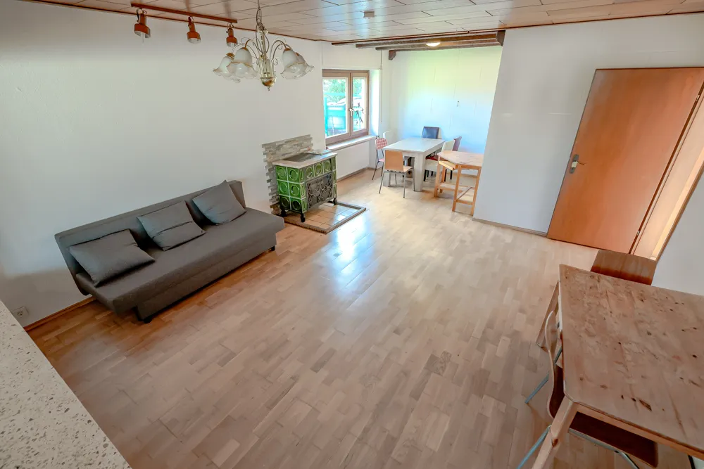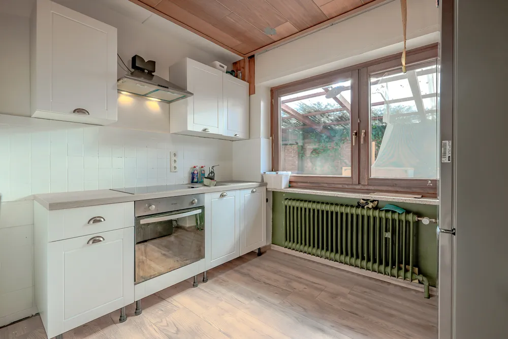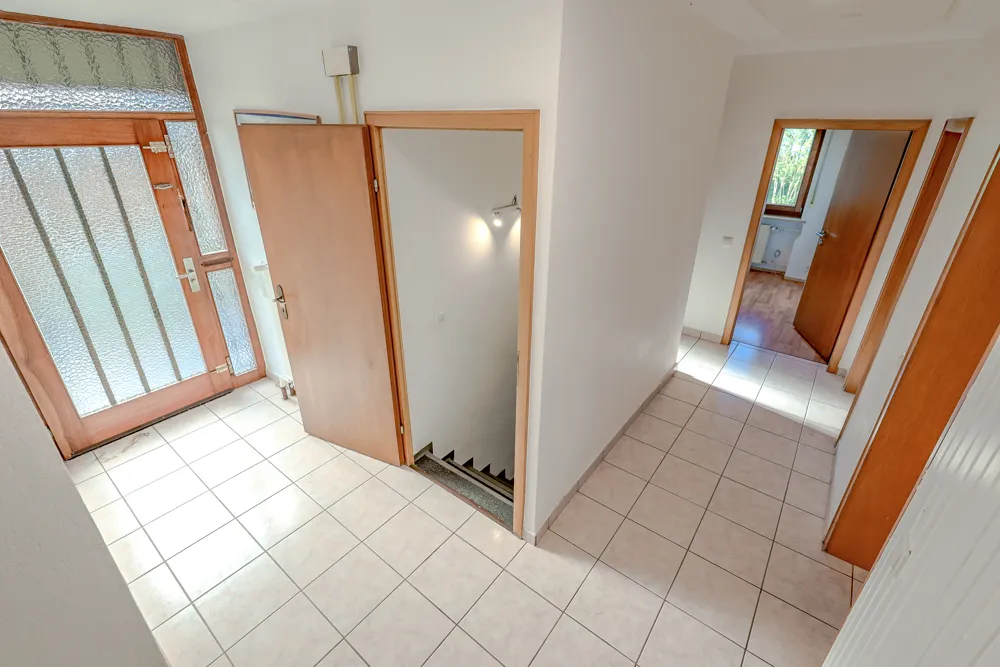 Über eine Treppe von der Einfahrt gelangt man in das eigentliche Wohngeschoss. Hier befinden sich eine Küche mit moderner Einbauküche, ein Badezimmer (mit Fenster, Dusche, WC und Waschtisch), ein Wintergarten sowie drei weitere Zimmer, die flexibel als Schlafzimmer, Arbeitszimmer oder Wohnzimmer genutzt werden können.