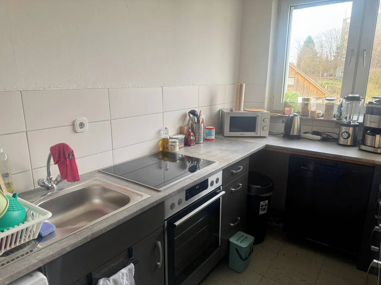 Die Küche bietet ausreichend Platz für den Anschluss einer Waschmaschine. Die Warmwasserversorgung erfolgt dezentral.