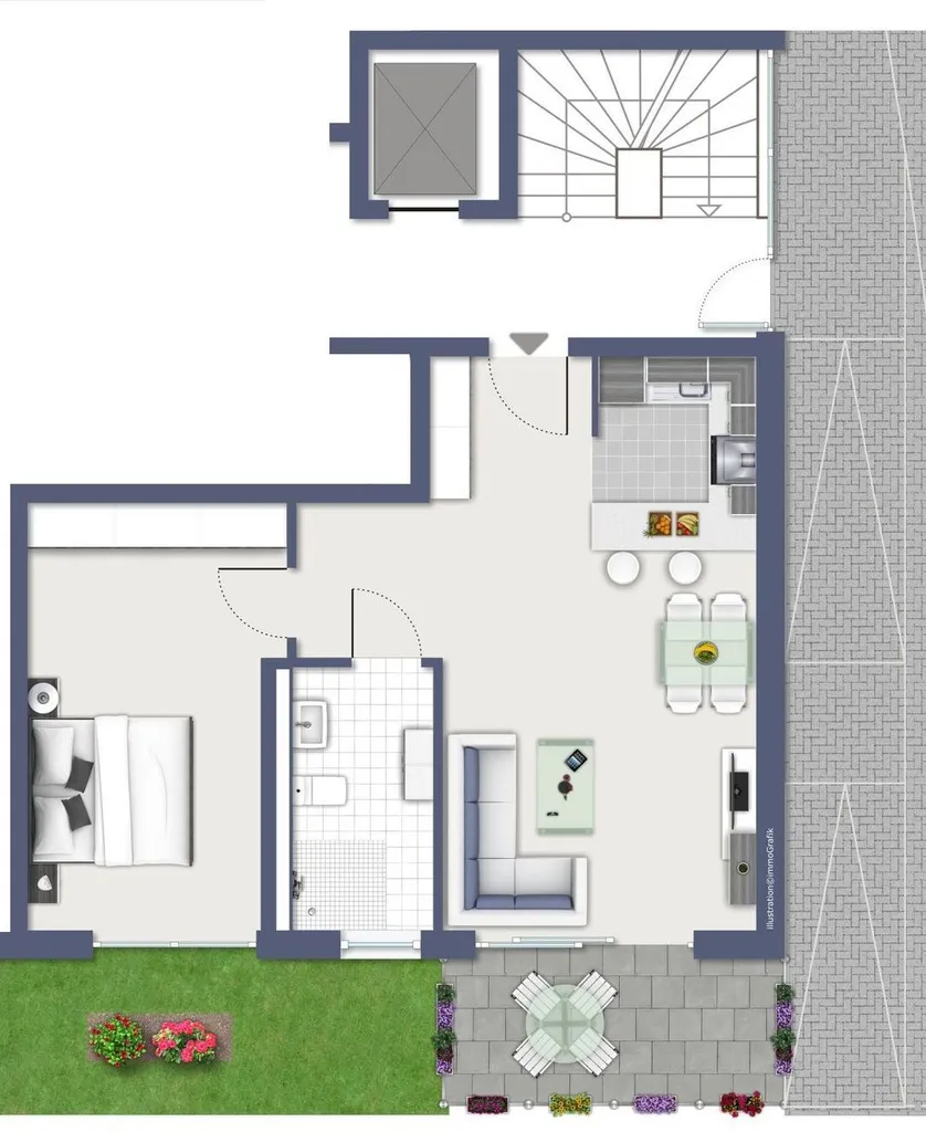 Alle Wohnungen sind barrierefrei bzw. -arm und bieten entweder eine Terrasse mit Garten oder Balkon / Dachterrasse.